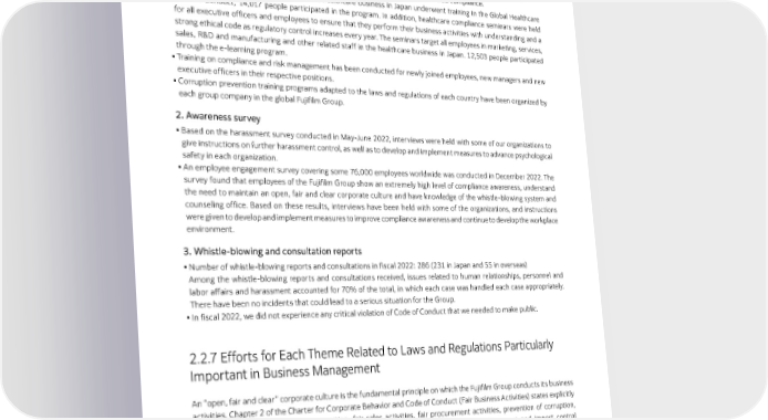 Governance 2.2.6 Achievements for Efforts to Promote Compliance 1. Compliance training ● All executive officers and employees of the Fujifilm Group worldwide received training on the Charter for Corporate Behavior and Code of Conduct; 96% participated in the training program and declared compliance. ● All executive officers and employees of the healthcare business in Japan underwent training in the Global Healthcare Code of Conduct; 14,017 people participated in the program. In addition, healthcare compliance seminars were held for all executive officers and employees to ensure that they perform their business activities with understanding and a strong ethical code as regulatory control increases every year. The seminars target all employees in marketing, services, sales, R&D and manufacturing and other related staff in the healthcare business in Japan. 12,503 people participated through the e-learning program. ● Training on compliance and risk management has been conducted for newly joined employees, new managers and new executive officers in their respective positions. ● Corruption prevention training programs adapted to the laws and regulations of each country have been organized by each group company in the global Fujifilm Group. 2. Awareness survey ● Based on the harassment survey conducted in May-June 2022, interviews were held with some of our organizations to give instructions on further harassment control, as well as to develop and implement measures to advance psychological safety in each organization. ● An employee engagement survey covering some 76,000 employees worldwide was conducted in December 2022. The survey found that employees of the Fujifilm Group show an extremely high level of compliance awareness, understand the need to maintain an open, fair and clear corporate culture and have knowledge of the whistle-blowing system and counseling office. Based on these results, interviews have been held with some of the organizations, and instructions were given to develop and implement measures to improve compliance awareness and continue to develop the workplace environment. 3. Whistle-blowing and consultation reports ● N umber of whistle-blowing reports and consultations in fiscal 2022: 286 (231 in Japan and 55 in overseas) Among the whistle-blowing reports and consultations received, issues related to human relationships, personnel and labor affairs and harassment accounted for 70% of the total, in which each case was handled each case appropriately. There have been no incidents that could lead to a serious situation for the Group. ● I n fiscal 2022, we did not experience any critical violation of Code of Conduct that we needed to make public. 2.2.7 Efforts for Each Theme Related to Laws and Regulations Particularly Important in Business Management An “open, fair and clear” corporate culture is the fundamental principle on which the Fujifilm Group conducts its business activities. Chapter 2 of the Charter for Corporate Behavior and Code of Conduct (Fair Business Activities) states explicitly that the Group will uphold fair competition, fair sales activities, fair procurement activities, prevention of corruption, prohibition of bribery and restrictions on gifts and entertainment and compliance with export and import control regulations. Similar provisions are stated explicitly in the Fujifilm Group Global Healthcare Code of Conduct. 1. Efforts for anti-corruption (bribery) In the Charter for Corporate Behavior and Code of Conduct, the Fujifilm Group has declared that we will refuse any involvement in corruption or in any dubious action that could cause suspicion of fraud with suppliers, business partners, public officials and government representatives. We took action to reduce the occurrence of priority risks related to corruption and bribery in fiscal 2022. Anti- corruption regulations in effect at Fujifilm Group companies in Japan and other countries are updated as required to adapt to new laws and revisions to existing laws and regulations. 37 FUJIFILM Holdings Corporation Sustainability Report 2023