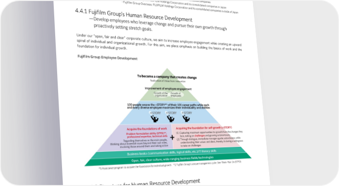 Social Aspects 4.4 Employee Development, Talent Attraction and Engagement Definitions in this section (Chapter 4.4) ・ Fujifilm Group: FUJIFILM Holdings Corporation and its consolidated companies ・ Fujifilm Group Japan: FUJIFILM Holdings Corporation and its consolidated companies in Japan ・ Fujifilm Group Overseas: FUJIFILM Holdings Corporation and its consolidated companies outside of Japan 4.4.1 Fujifilm Group’s Human Resource Development ― Develop employees who leverage change and pursue their own growth through proactively setting stretch goals. Under our “open, fair and clear” corporate culture, we aim to increase employee engagement while creating an upward spiral of individual and organizational growth. For this aim, we place emphasis on building the basics of work and the foundation for individual growth. Fujifilm Group Employee Development To become a company that creates change Realization of Value from Innovation Improvement of employee engagement Growth of the Growth of organization employees 100 people weave the +STORY*1 of their 100 career paths while each and every diverse employee maximizes their individuality and abilities Acquire the foundations of work Acquiring the foundation for self-growth (+STORY) Problem formulation ability (STPD)*2, (1) Capturing maximum opportunities for growth from the changes they professional expertise, technical skills face, taking on challenges and growing autonomously Regarding themselves as the main people, (2) Through dialogue, immediate managers guide subordinates while thinking about essential issues beyond their own roles, understanding their values and ideas, thereby fostering a willingness involving those around them and taking action to take on challenges Business basics (communication skills, logical skills, etc.)/IT literacy skills Open, fair, clear culture, wide-ranging business fields/technologies *1 Assistance program to acquire the foundation for individual growth *2 Fujifilm Group’s unique management cycle: See-Think-Plan-Do (STPD) 4.4.2 Structure for Human Resource Development 1. Human resource development programs (1) Build on the basics of work (Strengthening Problem formulation ability) The Fujifilm Group defines its basics of work as the FF method. This method is implemented in all divisions and departments across the Group. The FF method refers to the See-Think-Plan-Do (STPD) cycle, where See is to collect the factual information, Think is to capture their essence through consideration, Plan is to formulate approaches, and Do is to implement the plan. We develop all employees—from new employees to those working overseas—to acquire the FF method as an approach to their work. 121 FUJIFILM Holdings Corporation Sustainability Report 2023