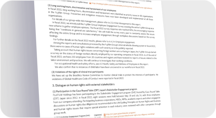 Social Aspects we are giving close attention to the issues and released a fiscal 2022 statement in response to the Modern Slavery Act 2015 of the UK and the Modern Slavery Act 2018 of Australia through our Group companies. In fiscal 2022, there were no reported incidents involving violations of the rights of indigenous peoples in the business activities and procurement activities of the Fujifilm Group. For details of our sustainable procurement activities, including activities related to conflict minerals and other themes that involve potential human rights violations, please refer to 2.5 Supply Chain Management in this report. Response to the Modern Slavery Act at Fujifilm Group  https://holdings.fujifilm.com/en/sustainability/activity/other-activities/human-rights#link03 (2) Long working hours, discrimination and harassment of our employees In fiscal 2022, long working hours, discrimination and harassment were identified as priority issues in 68 organizations in the Fujifilm Group. Preventive and mitigation measures have now been developed and implemented at all these organizations. For details of our group-wide risk management, please refer to 2.2.4 Risk Management in this report. In fiscal 2022, we introduced the Fujifilm Group Employee Engagement Survey covering the entire Fujifilm Group as a new scheme to gather employee opinions. The fiscal 2022 survey response rate reached 90%, the encouraging response being that "conditions in general are satisfactory." We will hold the survey every year to constantly assess the issues affecting the entire Group and to increase employee engagement through workplace discussions based on the survey findings. For further details on the fiscal 2022 results, please refer to 4.4.3-4 Employee engagement. Among the reports and consultations processed by the Fujifilm Group’s internal whistle-blowing system in fiscal 2022, there were no cases of human rights violations with such severity as to be publicly reported. Taking account that human rights issues concerning foreign workers are surfacing in Japan, the Fujifilm Group started a survey on the status of foreign workers directly employed by our operating companies in fiscal 2019. As of the end of fiscal 2022, we have 232 employees from 20 countries and regions and have received no reports of issues related to the labor environment and practices. We will continue to investigate their working conditions. For occupational health and safety efforts, see 4.3 Health, Safety and Wellness of Employees in this report. We also confirm that no instances of child labor have been uncovered in our workforce in fiscal 2022. (3) Violations of the rights of clinical trial participants We have set up the Bioethics Review Committee to monitor clinical trials to protect the interests of participants. No violations of Global Healthcare Code of Conduct were reported in fiscal 2022. 3. Dialogue on human rights with external stakeholders (1) Participation in the Caux Round Table (CRT) Japan's Stakeholder Engagement program FUJIFILM Holdings has been participating in the Stakeholder Engagement program (SHE) hosted by Caux Round Table (CRT) Japan since 2012. In fiscal 2022, eight sessions were held between May 19 and July 14, with three employees from our company attending. Participating business corporations, NGOs, NPOs, academic experts and others engaged in discussions on human rights due diligence as recommended in the UN Guiding Principles on Human Rights and Business and human rights issues that require special attention in each industry were reviewed with other companies through group work. * CRT Stakeholder Engagement Program (SHE) (Japanese) http://crt-japan.jp/portfolio/she-program/ (English) http://crt-japan.jp/en/portfolio/human-rights-due-diligence-workshop/ (2) Participation in Business and Human Rights (B+HR) Academy hosted by the United Nations Development Programme (UNDP) FUJIFILM Holdings participated in the B+HR Academy hosted by the United Nations Development Programme (UNDP). The Academy was organized to support business efforts in Japan contributing to the implementation of human rights due diligence by businesses and the creation of responsible global supply chains for Japanese businesses, their affiliates, suppliers and business partners operating in 17 countries, with the cooperation of UNDP and the Japanese government. Fujifilm participated in the second session (February 27-28, 2023) held in Tokyo. Top Japanese and foreign authorities and experts in business and human rights provided insights into the laws and developments on human rights due diligence and implementation methods. We were able to look back at our initiatives through discussions with other participating companies. We will apply these findings to our human rights due diligence activities in the future. 131 FUJIFILM Holdings Corporation Sustainability Report 2023