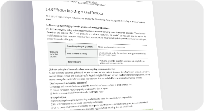 3.4 | Promoting Resource Recycling 1 Annual Changes in Reduction in export Packaging Material Weight* (Cumulative total) Unit: % FY2018 FY2019 FY2020 FY2021 FY2022 Packaging material reduction rate*2 17.8 14.1 15.4 12.9 10.6 *1 Total weight of export packaging materials handled by FUJIFILM Logistics in FY2022. *2 Packaging material reduction rate (%) = Weight reduced Total material weight + weight reduced 3.4.3 Effective Recycling of Used Products As a part of resource input reduction, we employ the Closed Loop Recycling System of recycling in different business areas. 1. Resource recycling system in Business Innovation business (1) Product recycling policy in Business Innovation business: Promoting reuse of resources for infinite “Zero disposal” Based on the concept that “used products are valuable resources, not waste,” our resource recycling system for multifunction devices takes the following three approaches for manufacturing aiming to reduce environmental impact across the product lifecycle. Closed Loop Recycling System Utilize used products as a resource Resource Inverse Manufacturing Create products under the premise of reusing parts to minimize recycling environmental impact system Zero Emissions Parts that cannot be reused are separated and recycled to be utilized again as new materials (2) Basic principle of international resource recycling system construction As our business becomes globalized, we aim to create an International Resource Recycling System across the areas we operate (Japan, China, and the Asia Pacific Region). In light of this aim, we have established the following systems for the resource recycling system for overseas operations so that our stakeholders can work with us without concern. [Basic approach in overseas operations] ① Manage and operate factories under the manufacturer’s responsibility to avoid potential risks ② Ensure consistent recycling quality equivalent to that in Japan ③ Reduce environmental impact in each country and region [Four principles] ① Prevent illegal dumping by collecting used products under the manufacturer’s responsibility ② Do not import items that could potentially end as waste ③ Do no cause environmental impact to the importer countries and regions (where recycling sites are established) ④ Offer benefits to the importer countries and regions (where recycling sites are established) FUJIFILMBusinessInnovationIntegratedRecyclingSystem https://www.fuji昀椀lm.com/fbglobal/eng/company/csr/svp2030/environment/recycle.html Aboutcollectingusedcartridges https://www.fuji昀椀lm.com/fb/support/cru/printer(inJapaneseonly) (3) Resource recycling New Resource Reduction by Using Reuse Parts in Business Innovation Business* Unit: tons FY2018 FY2019 FY2020 FY2021 FY2022 New Resource Reduction 2,967 3,393 3,145 3,777 4,050 * The total amount of new resource reduction in the production stage by using reuse parts. * Total for Japan and the Asia-Pacific Region as FUJIFILM Business Innovation trading areas until FY2020. 84 FUJIFILM Holdings Corporation Sustainability Report 2023