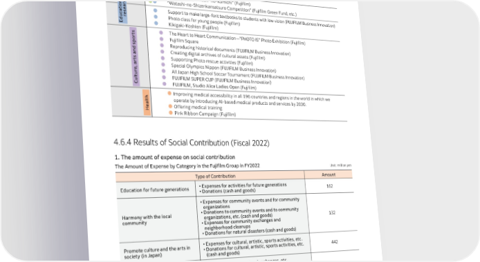 Social Aspects 4.6.3 Social Contribution Activities Continued by the Fujifilm Group t ● Voluntary tree planting activity in China and Vietnum (Fujifilm) en m ● Ground water conservation activities in Minami-Aso village (FUJIFILM Kyushu) n o ● Charitable Trust Fujifilm Green Fund (Fujifilm) r vi n nd ●● Kankyo-Nikki, “Midori-no-Komichi” (Fujifilm) E a ch ●● “Watashi-no-Shizenkansatsuro Competition” (Fujifilm Green Fund, etc.) on r i a t e a s ● Support to make large-font textbooks to students with low vision (FUJIFILM Business Innovation) e uc r ● Photo class for young people (Fujifilm) d E ● Kikigaki-Koshien (Fujifilm) s ● The Heart to Heart Communication—“PHOTO IS” Photo Exhibition (Fujifilm) t or ● Fujifilm Square p s ● Reproducing historical documents (FUJIFILM Business Innovation) nd a ● Creating digital archives of cultural assets (Fujifilm) s t ● Supporting Photo rescue activities (Fujifilm) r a ● Special Olympics Nippon (FUJIFILM Business Innovation) , e r ● All Japan High School Soccer Tournament (FUJIFILM Business Innovation) u lt u ● FUJIFILM SUPER CUP (FUJIFILM Business Innovation) C ● FUJIFILM, Studio Alice Ladies Open (Fujifilm) ●Improving medical accessibility in all 196 countries and regions in the world in which we lth operate by introducing AI-based medical products and services by 2030. a e H ●Offering medical training ●Pink Ribbon Campaign (Fujifilm) 4.6.4 Results of Social Contribution (Fiscal 2022) 1. The amount of expense on social contribution The Amount of Expense by Category in the Fujifilm Group in FY2022 Unit: million yen Type of Contribution Amount Education for future generations • Expenses for activities for future generations 162 • D onations (cash and goods) • E xpenses for community events and for community organizations Harmony with the local • D onations to community events and to community community organizations, etc. (cash and goods) 132 • E xpenses for community exchanges and neighborhood cleanups • D onations for natural disasters (cash and goods) Promote culture and the arts in • E xpenses for cultural, artistic, sports activities, etc. society (in Japan) • Donations for cultural, artistic, sports activities, etc. 442 (cash and goods) Consideration for the • E xpenses for international exchanges, etc. international community and • D onations for international exchanges, etc. (cash and 79 international cultures goods) • S upport for natural disasters (cash and goods) Cooperation with NGOs and • E xpenses for joint work NPOs • Donations for sponsorship and charity funding 233 • Support through providing products and services Total 1,047 * See Chapter 5. Sustainability Accounting * Values presented are rounded and the sums of the items do not always make up the totals. 135 FUJIFILM Holdings Corporation Sustainability Report 2023