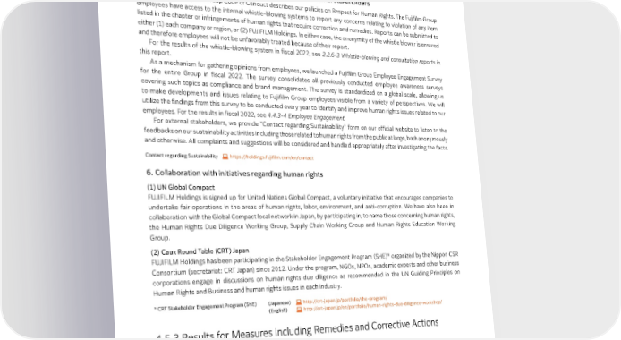 Social Aspects globally. We now conduct regular training programs for all executive officers and employees in the healthcare business. Complaints related to healthcare products and services are reported promptly to the relevant business division or affiliate. Appropriate investigation will then be carried out, followed by corrective measures where necessary. Complaints may be reported to the relevant regulatory authority where appropriate. 5. Human rights grievance mechanism for internal and external stakeholders Chapter 1 of the Fujifilm Group Code of Conduct describes our policies on Respect for Human Rights. The Fujifilm Group employees have access to the internal whistle-blowing systems to report any concerns relating to violation of any item listed in the chapter or infringements of human rights that require correction and remedies. Reports can be submitted to either (1) each company or region, or (2) FUJIFILM Holdings. In either case, the anonymity of the whistle blower is ensured and therefore employees will not be unfavorably treated because of their report. For the results of the whistle-blowing system in fiscal 2022, see 2.2.6-3 Whistle-blowing and consultation reports in this report. As a mechanism for gathering opinions from employees, we launched a Fujifilm Group Employee Engagement Survey for the entire Group in fiscal 2022. The survey consolidates all previously conducted employee awareness surveys covering such topics as compliance and brand management. The survey is standardized on a global scale, allowing us to make developments and issues relating to Fujifilm Group employees visible from a variety of perspectives. We will utilize the findings from this survey to be conducted every year to identify and improve human rights issues related to our employees. For the results in fiscal 2022, see 4.4.3-4 Employee Engagement. For external stakeholders, we provide “Contact regarding Sustainability” form on our official website to listen to the feedbacks on our sustainability activities including those related to human rights from the public at large, both anonymously and otherwise. All complaints and suggestions will be considered and handled appropriately after investigating the facts. Contact regarding Sustainability https://holdings.fujifilm.com/en/contact 6. Collaboration with initiatives regarding human rights (1) UN Global Compact FUJIFILM Holdings is signed up for United Nations Global Compact, a voluntary initiative that encourages companies to undertake fair operations in the areas of human rights, labor, environment, and anti-corruption. We have also been in collaboration with the Global Compact local network in Japan, by participating in, to name those concerning human rights, the Human Rights Due Diligence Working Group, Supply Chain Working Group and Human Rights Education Working Group. (2) Caux Round Table (CRT) Japan FUJIFILM Holdings has been participating in the Stakeholder Engagement Program (SHE)* organized by the Nippon CSR Consortium (secretariat: CRT Japan) since 2012. Under the program, NGOs, NPOs, academic experts and other business corporations engage in discussions on human rights due diligence as recommended in the UN Guiding Principles on Human Rights and Business and human rights issues in each industry. * CRT Stakeholder Engagement Program (SHE) (Japanese) http://crt-japan.jp/portfolio/she-program/ (English) http://crt-japan.jp/en/portfolio/human-rights-due-diligence-workshop/ 4.5.3 Results for Measures Including Remedies and Corrective Actions 1. Establishing and disseminating policies related to human rights (1) Fujifilm Group Charter for Corporate Behavior and Code of Conduct In addition to providing appropriate training programs, the Fujifilm Group requires all executive officers and employees in the worldwide Group to comply with its basic stance on respect for human rights as stated in the Fujifilm Group Charter for Corporate Behavior and Code of Conduct. In fiscal 2022, all executive officers and employees worldwide complied, and 96% underwent training and have issued declarations. Additionally, stratified training on respect for human rights is being conducted for new employees, newly appointed managers and newly appointed executive officers. (2) Fujifilm Group Global Healthcare Code of Conduct In fiscal 2020, the Fujifilm Group established its Global Healthcare Code of Conduct to make clear its stance on respect for human rights in its healthcare business activities. In-house Guidelines on the Global Healthcare Code of Conduct that 129 FUJIFILM Holdings Corporation Sustainability Report 2023