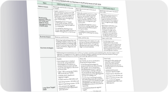 1.2 | CSR Management 2. Relationship between CSR plan and management plan Our CSR plan SVP 2030 toward fiscal 2030 is our targets for contributing to building a sustainable society along with SDG’s. Our Medium-Term Management Plan VISION 2023 sets out the concrete business strategies to achieve these targets. Themes That Are Significantly Related with our Business in the Priority Issues of SVP 2030 Item CSR Priority Issue 1 CSR Priority Issue 2 CSR Priority Issue 3 Material Issues Resolving social issues in the area Resolving social issues in the area of Resolving social issues in the area of of Health Daily Life Work Style • Health, a priority issue in our CSR • Daily Life, a priority issue in our CSR • Work Style, a priority issue in our plan SVP 2030, matches activities plan SVP 2030, matches activities CSR plan SVP 2030, matches aimed at the business targets for aimed at the business targets for activities aimed at the business healthcare, a priority business in “Materials” and “Imaging” that are targets for Business Innovation, a Relationship the medium-term management priority business operations in the priority business in the medium- between CSR plan plan VISION 2023. medium-term management plan term management plan VISION SVP 2030 and • The priority issue of “Health” VISION 2023. 2023. Medium-Term in SVP 2030 includes activities • In the Materials segment, actions • Work Style in SVP 2030 is also Management Plan aimed at improving the health of are aimed at creating a better social designed to achieve a more VISION 2023 our employees. infrastructure specified as Goal 9 efficient work style for our • It is aimed at resolving social among the SDGs. employees through various issues regarding health and also at • In Imaging, actions are aimed at programs. In other words, it health management in the Group. achieving the wellbeing that society is aimed at work style reform needs. through the whole of society, including the Fujifilm Group. Business Impact Revenue, profit & risks Sales, profit & risks Sales, profit & risks • Reducing medical disparities and • Contributing to the creation of a safe • Contributing to social building a healthy society through and secure society amid advances in transformation that provides global availability of leading-edge digital transformation, through the fulfillment in work for everyone, by products and services in all of the development and supply of cutting- making available on a global scale Business strategies areas, prevention, diagnosis and edge functional materials. products and solutions services treatment. that bring greater productivity and stimulate greater creativity. • Addressing environmental issues in all of our business operations and establishing CO reduction targets in each 2 segment in recognition of the urgency of climate change as a global issue and of activities aimed at creating a decarbonized society as a criterion in participating in global business. [Health] [Daily Life] [Work Style] • Improving access to medical By FY2030, we aim to contribute to • Offering 50 million people work services by using medical AI achieving the targets below: styles that support employee technologies to introduce our • (1) Developing technologies for productivity and creativity products and services to all 196 products and services and promoting through solutions services that countries and regions in the world their greater use to contribute to bring innovation to our business by by fiscal 2030. the development of an ICT, and (2) fiscal 2030. • Index: 100 countries by FY2023, Contributing to creating a safe and • (VISION 2023) Business 196 countries by FY2030 secure society by improving safety in Innovation segment targets: • (VISION 2023) Healthcare social infrastructure through diagnostic FY2023 revenue: 820 billion yen segment targets: services for buildings, etc. Operating income: 82 billion yen FY2023 revenue: 860 billion yen • Contributing to enriching humanity Ratio of operating income: 10% Operating income: 103 billion yen and relationships between people by making people’s lives peaceful through CO emissions by segment photographic and video records and 2 Ratio of operating income: 12.0% compared to the FY2013 level: CO emissions by segment photographic products that preserve 55% reduction Long-Term Target/ 2 memories. Index compared to the FY2013 level: 15% reduction • (VISION2023) Materials segment targets: FY2023 revenue: 720 billion yen Operating income: 95 billion yen Ratio of operating income: 13.2% CO emissions by segment compared to 2 the FY2013 level: 33% reduction • (VISION2023) Imaging segment targets: FY2023 revenue: 300 billion yen Operating income: 25 billion yen Ratio of operating income: 8.3% CO emissions by segment compared to 2 the FY2013 level: 52% reduction Target Year FY2023, FY2030 FY2023, FY2030 FY2023, FY2030 16 FUJIFILM Holdings Corporation Sustainability Report 2023