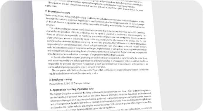 2.2 | Compliance and Risk Management 2.2.9 Privacy Protection 1. Basic policy In the Fujifilm Group Code of Conduct, which sets out how employees in Japan and other countries should conduct themselves, we recognize the protection of personal data as an important human rights issue. We require each of our Group companies to establish personal data protection policies and privacy policies that include provisions shared by the entire Group. The entire Group maintains a personal data protection policy based on OECD Privacy Principles. These policies are also being implemented at suppliers and contractors of the Fujifilm Group and cover the entire supply chain. 2. Promotion structure Based on the Privacy Policy, the Fujifilm Group established the Global Personal Information Protection Regulations and the Personal Information Management Regulations to specify the methods of handling personal data. The General Manager of the ESG Division is appointed as the officer responsible for building and maintaining the personal data protection structure. The policies and targets related to the group-wide personal data protection are determined by the ESG Committee, chaired by the president of FUJIFILM Holdings, and its report is submitted to the Board of Directors regularly. The Board of Directors is responsible for monitoring group-wide compliance and risk management, including protection of personal data, as one of the priority issues. In this way, we ensure the effectiveness of the process. After the ESG Committee has determined policies concerning personal data protection, the ESG Division of FUJIFILM Holdings takes responsibility for overall management of such policy implementation and other privacy protection. The ESG Division’s tasks include dissemination of the policies and targets, implementation of such policies, inspecting the implementation and management status, promoting details of the Personal Information Management Regulations among employees, and providing instructions and advice to managers of organizations that handle personal data. In the risks identified each year, protecting personal information is recognized as a priority risk for the entire Group, with action required by law, including development and implementation of a management system. In addition, the officers responsible for personal information management at each organization in our Group companies and organizations are continually instigating measures to protect personal information. The companies with ISMS certification or the Privacy Mark certification are implementing improvement activities with regular audits by external audit firms and audit results. 3. Employee training Please refer to 2.2.8-2 (4) Employee training. 4. Appropriate handling of personal data The Fujifilm Group has established the Policy on Personal Information Protection, Privacy Policy and internal regulations on the handling of personal data (such as the Global Personal Information Protection Regulations and the Personal Information Management Regulations and various guidelines) to implement appropriate safety management measures and protect personal data held by the Group. Updates on its Personal Information Protection Policy and Privacy Policy are disclosed on the Fujifilm website, acquiring the appropriate consent of the person in question where required by law. Also, secondary use of customer data is prohibited by our internal regulations. Once a year, each business division conducts an inventory of the personal data held by the division, to confirm and correct safety control measures and to perform other procedures, such as the deletion of personal data that is no longer necessary. The inventory status for each organization is audited by the ESG Division of FUJIFILM Holdings. In the work regulations, punitive action is imposed on any employee who takes company information outside of the company without authorization. At the same time, near-miss cases, including those that have occurred in other companies, are shared as a caution and to raise awareness. We take various measures to prevent information taken out of the company to assure protection of personal data. When a government organization requests disclosure in compliance with the law, we confirm the details of the request and the applicable law in deciding the most appropriate way to protect personal data. 44 FUJIFILM Holdings Corporation Sustainability Report 2023