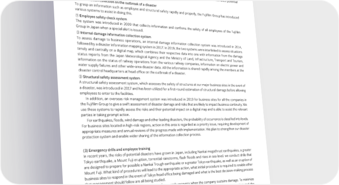 Governance To improve the Group’s ability to address a wide-area disaster, the Fujifilm Group is adding and strengthening the measures to be taken when a natural disaster is anticipated. For torrential rain, we use information on rainstorms and river system water levels made available by the administrative authorities to strengthen preparatory measures in each region. We also use the information to predict changes in river water levels and develop a groupwide system to issue alerts when the warning criteria are reached. Each business site established a manual to respond to the alerts and estimates potential disasters and takes early countermeasures. (2) Information collection on the outbreak of a disaster To grasp an information such as employee and structural safety rapidly and properly, the Fujifilm Group has introduced various systems to assist in doing this. ① Employee safety check system The system was introduced in 2009 that collects information and confirms the safety of all employees of the Fujifilm Group in Japan when a special alert is issued. ② Internal damage information collection system To assess damage to business operations, an internal damage information collection system was introduced in 2014, followed by a disaster information mapping system in 2017. In 2019, the two systems were interlinked to assess situations timely and centrally on a digital map, which combines their respective data into one with information from the damage status reports from the Japan Meteorological Agency and the Ministry of Land, Infrastructure, Transport and Tourism, information on the status of railway operations from the various railway companies, information on electric power and water supply failures and other wide-area disaster data. All the information is shared rapidly among the members at the disaster control headquarters at head office on the outbreak of a disaster. ③ Structural safety assessment system A structural safety assessment system, which assesses the safety of structures at our major business sites in the event of a disaster, was introduced in 2017 and has been utilized for a first-round estimation of structural damage before allowing employees to enter to the facilities. In addition, an overseas risk management system was introduced in 2019 for business sites for all the companies in the Fujifilm Group to give a swift assessment of disaster damage and risks that are likely to impact business continuity. We use these systems to rapidly assess the risks and their potential impact on a digital map and is able to assist the relevant parties in taking prompt action. For earthquakes, floods, wind damage and other leading disasters, the probability of occurrence is classified into levels. For business sites located in high-risk regions, action in this area is regarded as a priority issue, requiring development of appropriate measures and annual reviews of the progress made with implementation. We plan to strengthen our disaster protection system and enable wider sharing of the information collection process. (3) Emergency drills and employee training In recent years, the risks of potential disasters have grown in Japan, including Nankai megathrust earthquakes, a greater Tokyo earthquake, a Mount Fuji eruption, torrential rainstorms, flash floods and rises in sea level. we conduct drills that are designed to prepare for possible a Nankai Trough earthquake or a greater Tokyo earthquake, as well as an eruption of Mount Fuji. What kind of procedures will lead to the appropriate action, what initial procedure is required to enable other business sites to respond in the event of Tokyo head office being damaged and what is the best decision-making process that management should follow are all being studied. Our employees are the most important factor for an early recovery when the company sustains damage. To minimize damage from a disaster, each and every employee must increase their understanding of disaster protection and the required preparations. In addition to regular disaster prevention training, a disaster prevention portal has been created on the intranet to actively communicate the relevant information to employees. 47 FUJIFILM Holdings Corporation Sustainability Report 2023