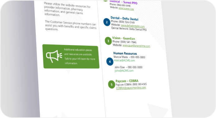 Contact Information Medical – UMR Claims Payer Phone: (800) 826-9781 Website: www.umr.com Important Contact 1 Medical - Surest PPO Information: Phone: (866) 683-6440 Please utilize the website resources for Website: www.surest.com provider information, pharmacy information, and general claims Dental – Delta Dental information. 2 Phone: (800) 524-0149 The Customer Service phone numbers can Website: www.deltadentalin.com assist you with benefits and specific claims Dental Network: Delta Dental PPO questions. 3 Vision - Guardian Phone: (800) 541-7846 Website: www.guardiananytime.com Additional education pieces Human Resources and resources are available. Marcia Maria – 000-000-0000 Talk to your HR team for more 4 [email protected] information. John Doe – 000-000-0000 [email protected] 5 Paycom – COBRA Paycom COBRA: (800) 580-4505 [email protected] Page 12 | ACME | Plan Year 2024 Open Enrollment This booklet provides only a summary of your benefits. All services described within are subject to the definitions, limitations, and exclusions set forth in each insurance carrier or provider’s contract.