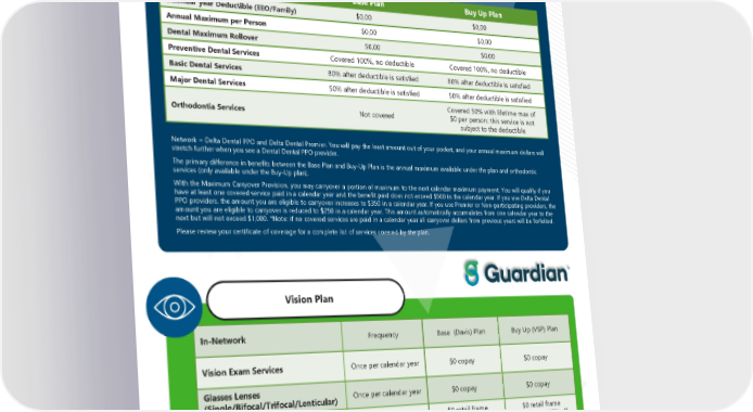 Dental & Vision Benefit Summary Dental Plan In-Network Base Plan Buy Up Plan Calendar year Deductible (EEO/Family) $0,00 $0,00 Annual Maximum per Person $0,00 $0,00 Dental Maximum Rollover $0,00 $0,00 Preventive Dental Services Covered 100%, no deductible Covered 100%, no deductible Basic Dental Services 80% after deductible is satisfied 80% after deductible is satisfied Major Dental Services 50% after deductible is satisfied 50% after deductible is satisfied Covered 50% with lifetime max of Orthodontia Services Not covered $0 per person; this service is not subject to the deductible Network = Delta Dental PPO and Delta Dental Premier. You will pay the least amount out of your pocket, and your annual maximum dollars will stretch further when you see a Dental Dental PPO provider. The primary difference in benefits between the Base Plan and Buy-Up Plan is the annual maximum available under the plan and orthodontic services (only available under the Buy-Up plan). With the Maximum Carryover Provision, you may carryover a portion of maximum to the next calendar maximum payment. You will qualify if you have at least one covered service paid in a calendar year and the benefit paid does not exceed $500 in the calendar year. If you use Delta Dental PPO providers, the amount you are eligible to carryover increases to $350 in a calendar year. If you use Premier or Non-participating providers, the amount you are eligible to carryover is reduced to $250 in a calendar year. This amount automatically accumulates from one calendar year to the next but will not exceed $1,000. *Note: if no covered services are paid in a calendar year all carryover dollars from previous years will be forfeited. Please review your certificate of coverage for a complete list of services covered by the plan. Vision Plan In-Network Frequency Base (Davis) Plan Buy Up (VSP) Plan Vision Exam Services Once per calendar year $0 copay $0 copay Glasses Lenses Once per calendar year $0 copay $0 copay (Single/Bifocal/Trifocal/Lenticular) $0 retail frame $0 retail frame Glasses Frames Once per calendar year allowance +20% off allowance +20% off remaining balance remaining balance Contact Lenses (Medically $0 copay/$25 $0 copay/$0 retail Necessary/Elective) Once per calendar year copay with $0 allowance retail allowance Page 11 | ACME | Plan Year 2024 Open Enrollment This booklet provides only a summary of your benefits. All services described within are subject to the definitions, limitations, and exclusions set forth in each insurance carrier or provider’s contract.