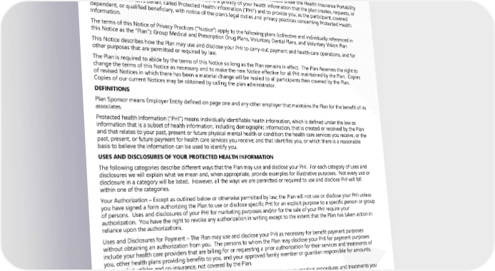 Legal Notices for 2024 NOTICE OF PRIVACY PRACTICES: This notice described how medical information about you may be used and disclosed and how you can get access to this information. Please review it carefully. Certain employer-sponsored health plans are required by the privacy regulations issued under the Health Insurance Portability and Accountability Act of 1996 (“HIPAA”) to maintain the privacy of your health information that the plan creates, requests, or is created on the Plan’s behalf, called Protected Health Information (“PHI”) and to provide you, as the participant, covered dependent, or qualified beneficiary, with notice of the plan’s legal duties and privacy practices concerning Protected Health Information. The terms of this Notice of Privacy Practices (“Notice”) apply to the following plans (collective and individually referenced in this Notice as the “Plan”): Group Medical and Prescription Drug Plans, Voluntary Dental Plans, and Voluntary Vision Plan This Notice describes how the Plan may use and disclose your PHI to carry-out payment and health care operations, and for other purposes that are permitted or required by law. The Plan is required to abide by the terms of this Notice so long as the Plan remains in effect. The Plan Reserves the right to change the terms of this Notice as necessary and to make the new Notice effective for all PHI maintained by the Plan. Copies of revised Notices in which there has been a material change will be mailed to all participants then covered by the Plan. Copies of our current Notices may be obtained by calling the plan administrator. DEFINITIONS Plan Sponsor means Employer Entity defined on page one and any other employer that maintains the Plan for the benefit of its associates. Protected health Information (“PHI”) means individually identifiable health information, which is defined under the law as information that is a subset of health information, including demographic information, that is created or received by the Plan and that relates to your past, present or future physical mental health or condition; the health care services you receive, or the past, present, or future payment for health care services you receive; and that identifies you, or which there is a reasonable basis to believe the information can be used to identify you. USES AND DISCLOSURES OF YOUR PROTECTED HEALTH INFORMATION The following categories describe different ways that the Plan may use and disclose your PHI. For each category of uses and disclosures we will explain what we mean and, when appropriate, provide examples for illustrative purposes. Not every use or disclosure in a category will be listed. However, all the ways we are permitted or required to use and disclose PHI will fall within one of the categories. Your Authorization – Except as outlined below or otherwise permitted by law, the Plan will not use or disclose your PHI unless you have signed a form authorizing the Plan to use or disclose specific PHI for an explicit purpose to a specific person or group of persons. Uses and disclosures of your PHI for marketing purposes and/or for the sale of your PHI require your authorization. You have the right to revoke any authorization in writing except to the extent that the Plan has taken action in reliance upon the authorizations. Uses and Disclosures for Payment – The Plan may use and disclose your PHI as necessary for benefit payment purposes without obtaining an authorization from you. The persons to whom the Plan may disclose your PHI for payment purposes include your health care providers that are billing for or requesting a prior authorization for their services and treatments of you, other health plans providing benefits to you, and your approved family member or guardian responsible for amounts, such as deductibles and co-insurance, not covered by the Plan. For example, the Plan may use or disclose your PHI, including information about any medical procedures and treatments you have received, are receiving, or will receive, to your doctor, your spouse’s doctor or other health plan under which you are covered, and your spouse or other family members, unless you object, in order to process your benefits under the Plan. Examples of other payment activities include determinations of your eligibility or coverage under the Plan, annual premium calculations based on health status and demographic characteristics of persons covered under the Plan, billing, claims management, reinsurance claim, and review of health care services with respect to medical necessity, utilization review activities, and disclosures to consumer reporting agencies. Page 6 | ACME| Plan Year 2024 Open Enrollment This Compliance Overview is not intended to be exhaustive nor should any discussion or opinions be construed as legal advice. Readers should contact legal counsel for legal advice.