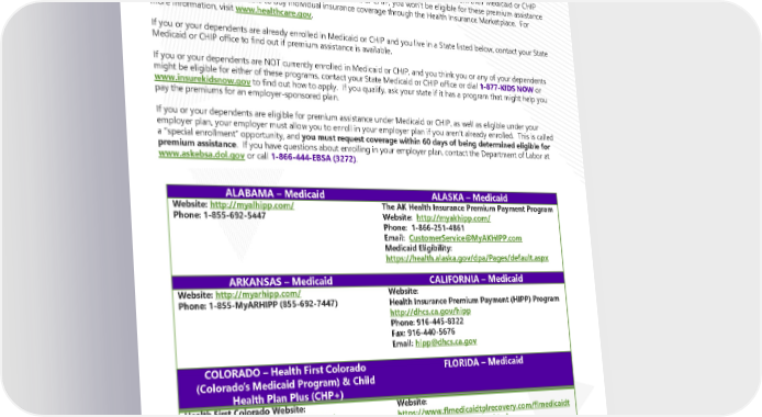 Legal Notices for 2024 Premium Assistance Under Medicaid and the Children’s Health Insurance Program (CHIP) If you or your children are eligible for Medicaid or CHIP and you’re eligible for health coverage from your employer, your state may have a premium assistance program that can help pay for coverage, using funds from their Medicaid or CHIP programs. If you or your children aren’t eligible for Medicaid or CHIP, you won’t be eligible for these premium assistance programs but you may be able to buy individual insurance coverage through the Health Insurance Marketplace. For more information, visit www.healthcare.gov. If you or your dependents are already enrolled in Medicaid or CHIP and you live in a State listed below, contact your State Medicaid or CHIP office to find out if premium assistance is available. If you or your dependents are NOT currently enrolled in Medicaid or CHIP, and you think you or any of your dependents might be eligible for either of these programs, contact your State Medicaid or CHIP office or dial 1-877-KIDS NOW or www.insurekidsnow.gov to find out how to apply. If you qualify, ask your state if it has a program that might help you pay the premiums for an employer-sponsored plan. If you or your dependents are eligible for premium assistance under Medicaid or CHIP, as well as eligible under your employer plan, your employer must allow you to enroll in your employer plan if you aren’t already enrolled. This is called a “special enrollment” opportunity, and you must request coverage within 60 days of being determined eligible for premium assistance. If you have questions about enrolling in your employer plan, contact the Department of Labor at www.askebsa.dol.gov or call 1-866-444-EBSA (3272). ALABAMA – Medicaid ALASKA – Medicaid Website: http://myalhipp.com/ The AK Health Insurance Premium Payment Program Phone: 1-855-692-5447 Website: http://myakhipp.com/ Phone: 1-866-251-4861 [email protected] Email: Medicaid Eligibility: https://health.alaska.gov/dpa/Pages/default.aspx ARKANSAS – Medicaid Website: CALIFORNIA – Medicaid Website: http://myarhipp.com/ Phone: 1-855-MyARHIPP (855-692-7447) Health Insurance Premium Payment (HIPP) Program http://dhcs.ca.gov/hipp Phone: 916-445-8322 Fax: 916-440-5676 Email: [email protected] COLORADO – Health First Colorado FLORIDA – Medicaid (Colorado’s Medicaid Program) & Child Health Plan Plus (CHP+) Health First Colorado Website: Website: https://www.healthfirstcolorado.com/ https://www.flmedicaidtplrecovery.com/flmedicaidt Health First Colorado Member Contact Center: plrecovery.com/hipp/index.html 1-800-221-3943/ State Relay 711 Phone: 1-877-357-3268 https://hcpf.colorado.gov/child-health-plan- CHP+: plus CHP+ Customer Service: 1-800-359-1991/ State Relay 711 Health Insurance Buy-In Program https://www.mycohibi.com/ (HIBI): HIBICustomer Service: 1-855-692-6442 Page 11 | ACME| Plan Year 2024 Open Enrollment This Compliance Overview is not intended to be exhaustive nor should any discussion or opinions be construed as legal advice. Readers should contact legal counsel for legal advice.