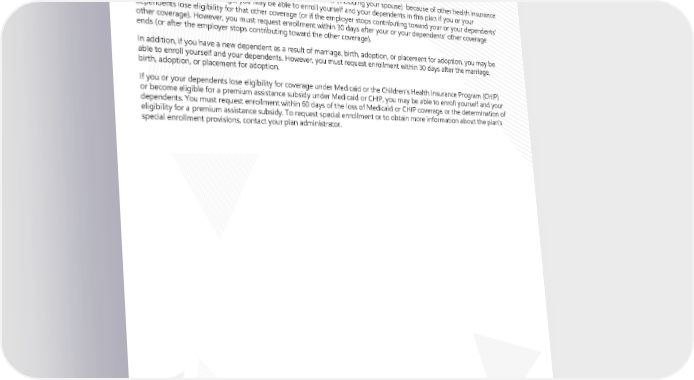 Legal Notices for 2024 HIPAA SPECIAL ENROLLMENT NOTICE If you are declining enrollment for yourself or your dependents (including your spouse) because of other health insurance or group health plan coverage, you may be able to enroll yourself and your dependents in this plan if you or your dependents lose eligibility for that other coverage (or if the employer stops contributing toward your or your dependents’ other coverage). However, you must request enrollment within 30 days after your or your dependents’ other coverage ends (or after the employer stops contributing toward the other coverage). In addition, if you have a new dependent as a result of marriage, birth, adoption, or placement for adoption, you may be able to enroll yourself and your dependents. However, you must request enrollment within 30 days after the marriage, birth, adoption, or placement for adoption. If you or your dependents lose eligibility for coverage under Medicaid or the Children’s Health Insurance Program (CHIP) or become eligible for a premium assistance subsidy under Medicaid or CHIP, you may be able to enroll yourself and your dependents. You must request enrollment within 60 days of the loss of Medicaid or CHIP coverage or the determination of eligibility for a premium assistance subsidy. To request special enrollment or to obtain more information about the plan's special enrollment provisions, contact your plan administrator. Page 10 | ACME| Plan Year 2024 Open Enrollment This Compliance Overview is not intended to be exhaustive nor should any discussion or opinions be construed as legal advice. Readers should contact legal counsel for legal advice.