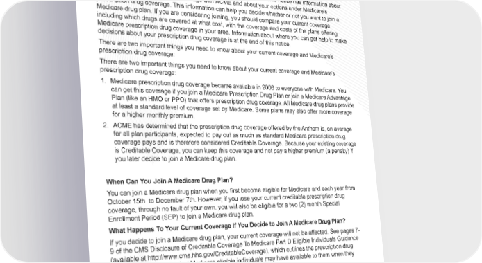 Medicare Part D Creditable IMPORTANT NOTICE FROM ACME ABOUT YOUR PRESCRIPTION DRUG COVERAGE AND MEDICARE Please read this notice carefully and keep it where you can find it. This notice has information about your current prescription drug coverage with ACME and about your options under Medicare’s prescription drug coverage. This information can help you decide whether or not you want to join a Medicare drug plan. If you are considering joining, you should compare your current coverage, including which drugs are covered at what cost, with the coverage and costs of the plans offering Medicare prescription drug coverage in your area. Information about where you can get help to make decisions about your prescription drug coverage is at the end of this notice. There are two important things you need to know about your current coverage and Medicare’s prescription drug coverage: There are two important things you need to know about your current coverage and Medicare’s prescription drug coverage: 1. Medicare prescription drug coverage became available in 2006 to everyone with Medicare. You can get this coverage if you join a Medicare Prescription Drug Plan or join a Medicare Advantage Plan (like an HMO or PPO) that offers prescription drug coverage. All Medicare drug plans provide at least a standard level of coverage set by Medicare. Some plans may also offer more coverage for a higher monthly premium. 2. ACME has determined that the prescription drug coverage offered by the Anthem is, on average for all plan participants, expected to pay out as much as standard Medicare prescription drug coverage pays and is therefore considered Creditable Coverage. Because your existing coverage is Creditable Coverage, you can keep this coverage and not pay a higher premium (a penalty) if you later decide to join a Medicare drug plan. When Can You Join A Medicare Drug Plan? You can join a Medicare drug plan when you first become eligible for Medicare and each year from October 15th to December 7th. However, if you lose your current creditable prescription drug coverage, through no fault of your own, you will also be eligible for a two (2) month Special Enrollment Period (SEP) to join a Medicare drug plan. What Happens To Your Current Coverage If You Decide to Join A Medicare Drug Plan? If you decide to join a Medicare drug plan, your current coverage will not be affected. See pages 7- 9 of the CMS Disclosure of Creditable Coverage To Medicare Part D Eligible Individuals Guidance (available at http://www.cms.hhs.gov/CreditableCoverage), which outlines the prescription drug plan provisions/options that Medicare eligible individuals may have available to them when they become eligible for Medicare Part D.] If you do decide to join a Medicare drug plan and drop your current coverage, be aware that you and your dependents will be able to get this coverage back. Page 3 | ACME| Plan Year 2024 Open Enrollment This Compliance Overview is not intended to be exhaustive nor should any discussion or opinions be construed as legal advice. Readers should contact legal counsel for legal advice.