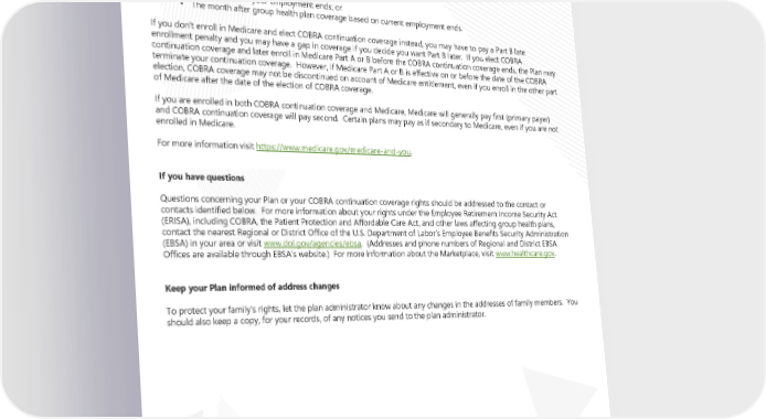 COBRA Can I enroll in Medicare instead of COBRA continuation coverage after my group health plan coverage ends? In general, if you don’t enroll in Medicare Part A or B when you are first eligible because you are still employed, after the Medicare initial enrollment period, you have an 8-month special enrollment period1 to sign up for Medicare Part A or B, beginning on the earlier of • The month after your employment ends; or • The month after group health plan coverage based on current employment ends. f you don’t enroll in Medicare and elect COBRA continuation coverage instead, you may have to pay a Part B late I enrollment penalty and you may have a gap in coverage if you decide you want Part B later. If you elect COBRA continuation coverage and later enroll in Medicare Part A or B before the COBRA continuation coverage ends, the Plan may terminate your continuation coverage. However, if Medicare Part A or B is effective on or before the date of the COBRA election, COBRA coverage may not be discontinued on account of Medicare entitlement, even if you enroll in the other part of Medicare after the date of the election of COBRA coverage. If you are enrolled in both COBRA continuation coverage and Medicare, Medicare will generally pay first (primary payer) and COBRA continuation coverage will pay second. Certain plans may pay as if secondary to Medicare, even if you are not enrolled in Medicare. For more information visit https://www.medicare.gov/medicare-and-you. If you have questions Questions concerning your Plan or your COBRA continuation coverage rights should be addressed to the contact or contacts identified below. For more information about your rights under the Employee Retirement Income Security Act (ERISA), including COBRA, the Patient Protection and Affordable Care Act, and other laws affecting group health plans, contact the nearest Regional or District Office of the U.S. Department of Labor’s Employee Benefits Security Administration www.dol.gov/agencies/ebsa. (Addresses and phone numbers of Regional and District EBSA (EBSA) in your area or visit www.healthcare.gov. Offices are available through EBSA’s website.) For more information about the Marketplace, visit Keep your Plan informed of address changes To protect your family’s rights, let the plan administrator know about any changes in the addresses of family members. You should also keep a copy, for your records, of any notices you send to the plan administrator. Page 23 | ACME| Plan Year 2024 Open Enrollment This Compliance Overview is not intended to be exhaustive nor should any discussion or opinions be construed as legal advice. Readers should contact legal counsel for legal advice.