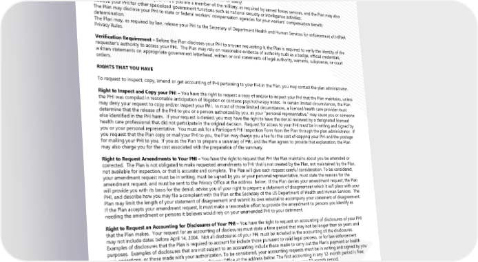 Legal Notices for 2024 The Plan may disclose your PHI to the proper authorities for law enforcement purposes, including the disclosure of certain identifying information requested by police officers for the purpose of identifying or locating a suspect, fugitive, material witness or missing person; the disclosure of your PHI if you are suspected to be a victim of a crime and you are incapacitated; or if you are suspected of committing a crime on the Plan (e.g., fraud). The Plan may use or disclose PHI to avert a serious threat to health or safety. The Plan may use or disclose your PHI if you are a member of the military, as required by armed forces services, and the Plan may also disclose your PHI for other specialized government functions such as national security or intelligence activities. The Plan may disclose your PHI to state or federal workers’ compensation agencies for your workers’ compensation benefit determination. The Plan may, as required by law, release your PHI to the Secretary of Department Health and Human Services for enforcement of HIPAA Privacy Rules. Verification Requirement – Before the Plan discloses your PHI to anyone requesting it, the Plan is required to verify the identity of the requester’s authority to access your PHI. The Plan may rely on reasonable evidence of authority such as a badge, official credentials, written statements on appropriate government letterhead, written or oral statements of legal authority, warrants, subpoenas, or court orders. RIGHTS THAT YOU HAVE To request to inspect, copy, amend or get accounting of PHI pertaining to your PHI in the Plan, you may contact the plan administrator. Right to Inspect and Copy your PHI – You have the right to request a copy of and/or to inspect your PHI that the Plan maintains, unless the PHI was compiled in reasonable anticipation of litigation or contains psychotherapy notes. In certain limited circumstances, the Plan may deny your request to copy and/or inspect your PHI. In most of those limited circumstances, a licensed health care provider must determine that the release of the PHI to you or a person authorized by you, as your “personal representative,” may cause you or someone else identified in the PHI harm. If your request is denied, you may have the right to have the denial reviewed by a designated licensed health care professional that did not participate in the original decision. Request for access to your PHI must be in writing and signed by you or your personal representative. You must ask for a Participant PHI Inspection Form from the Plan through the plan administrator. If you request that the Plan copy or mail your PHI to you, the Plan may charge you a fee for the cost of copying your PHI and the postage for mailing your PHI to you. If you as the Plan to prepare a summary of PHI, and the Plan agrees to provide that explanation, the Plan may also charge you for the cost associated with the preparation of the summary. Right to Request Amendments to Your PHI – You have the right to request that PHI the Plan maintains about you be amended or corrected. The Plan is not obligated to make requested amendments to PHI that is not created by the Plan, not maintained by the Plan, not available for inspection, or that is accurate and complete. The Plan will give each request careful consideration. To be considered, your amendment request must be in writing, must be signed by you or your personal representative, must state the reasons for the amendment request, and must be sent to the Privacy Office at the address below. If the Plan denies your amendment request, the Plan will provide you with its basis for the denial, advise you of your right to prepare a statement of disagreement which it will place with your PHI, and describe how you may file a complaint with the Plan or the Secretary of the US Department of Health and Human Services. The Plan may limit the length of your statement of disagreement and submit its own rebuttal to accompany your statement of disagreement. If the Plan accepts your amendment request, it must make a reasonable effort to provide the amendment to persons you identify as needing the amendment or persons it believes would rely on your unamended PHI to your detriment. Right to Request an Accounting for Disclosures of Your PHI – You have the right to request an accounting of disclosures of your PHI that the Plan makes. Your request for an accounting of disclosures must state a time period that may not be longer than six years and may not include dates before April 14, 2004. Not all disclosures of your PHI must be included in the accounting of the disclosures. Examples of disclosures that the Plan is required to account for include those pursuant to valid legal process, or for law enforcement purposes. Examples of disclosures that are not subject to an accounting include those made to carry out the Plan’s payment or health care operations, or those made with your authorization. To be considered, your accounting requests must be in writing and signed by you or your personal representative, and sent to the Privacy Office at the address below. The first accounting in any 12-month period is free; however, the Plan may charge you a fee for each subsequent accounting you request within the same 12-month period. Right to Place Restrictions on the Use and Disclosure of Your PHI – You have the right to request restrictions on certain of the Plan’s uses and disclosures of your PHI for payment or health care operations, disclosures made to persons involved in your care, and disclosures for disaster relief purposes. For example, you may request that the Plan not disclose your PHI to your spouse. Your request must describe in detail the restriction you are requesting. The Plan is not required to agree to your request, but will attempt to accommodate reasonable requests when appropriate. The Plan retains the right to terminate an agreed-to restriction if it believes such 