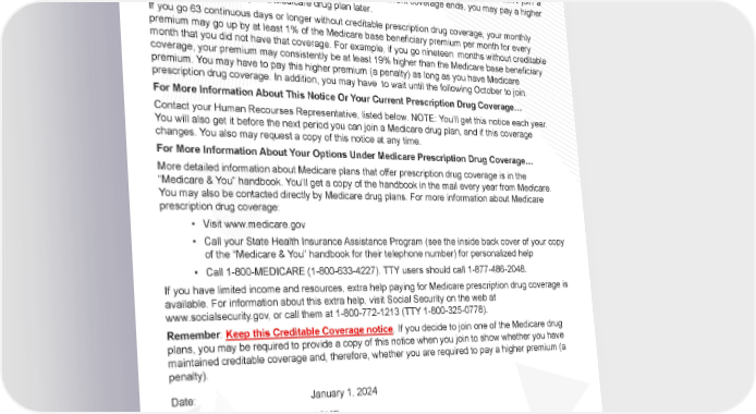 Medicare Part D Creditable When Will You Pay A Higher Premium (Penalty) To Join A Medicare Drug Plan? You should also know that if you drop or lose your current coverage with ACME and don’t join a Medicare drug plan within 63 continuous days after your current coverage ends, you may pay a higher premium (a penalty) to join a Medicare drug plan later. If you go 63 continuous days or longer without creditable prescription drug coverage, your monthly premium may go up by at least 1% of the Medicare base beneficiary premium per month for every month that you did not have that coverage. For example, if you go nineteen months without creditable coverage, your premium may consistently be at least 19% higher than the Medicare base beneficiary premium. You may have to pay this higher premium (a penalty) as long as you have Medicare prescription drug coverage. In addition, you may have to wait until the following October to join. For More Information About This Notice Or Your Current Prescription Drug Coverage… Contact your Human Recourses Representative, listed below. NOTE: You’ll get this notice each year. the next period you can join a Medicare drug plan, and if this coverage You will also get it before changes. You also may request a copy of this notice at any time. For More Information About Your Options Under Medicare Prescription Drug Coverage… More detailed information about Medicare plans that offer prescription drug coverage is in the “Medicare & You” handbook. You’ll get a copy of the handbook in the mail every year from Medicare. You may also be contacted directly by Medicare drug plans. For more information about Medicare prescription drug coverage: • Visit www.medicare.gov • Call your State Health Insurance Assistance Program (see the inside back cover of your copy of the “Medicare & You” handbook for their telephone number) for personalized help • Call 1-800-MEDICARE (1-800-633-4227). TTY users should call 1-877-486-2048. If you have limited income and resources, extra help paying for Medicare prescription drug coverage is available. For information about this extra help, visit Social Security on the web at www.socialsecurity.gov, or call them at 1-800-772-1213 (TTY 1-800-325-0778). Remember: Keep this Creditable Coverage notice. If you decide to join one of the Medicare drug plans, you may be required to provide a copy of this notice when you join to show whether you have maintained creditable coverage and, therefore, whether you are required to pay a higher premium (a penalty). Date: January 1, 2024 Name of Entity/Sender: ACME Contact Position/Office: Marcia Maria, HR Business Partner Address: Phone Number: 000-000-0000 Page 4 | ACME| Plan Year 2024 Open Enrollment This Compliance Overview is not intended to be exhaustive nor should any discussion or opinions be construed as legal advice. Readers should contact legal counsel for legal advice.