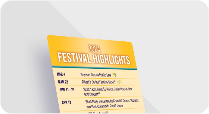 2024 FESTIVAL HIGHLIGHTS MAR 4 Pegasus Pins on Public Sale SM TICKET MAR 28 Dillard’s Spring Fashion Show EVENT APR 11 - 21 Stock Yards Bank $1 Million Dollar Hole-in-One Golf ContestSM APR 13 Block Party Presented by Churchill Downs, Humana and Park Community Credit Union SM APR 14 PNC Tour de Lou APR 19 They’re Off!® Luncheon Presented by TICKET BAE Systems, Fifth Third Bank and Heartland EVENT ® APR 20 Thunder Over Louisville Presented by TICKET Caesars Southern Indiana, Humana, EVENT LG&E, Meijer and UPS APR 20 Louisville Muhammad Ali International Airport Thunder Over Louisville VIP Rooftop TICKET EVENT Party Presented by Farm Credit Mid-America and Kentucky Proud APR 25 - 26 Dick’s Sporting Goods Race Expo and Packet Pick-up ® SM APR 25 - MAY 3 Kroger’s Fest-a-Ville on the Waterfront APR 26 - 27 L&N Federal Credit Union Great BalloonFestSM ® APR 27 GE Appliances miniMarathon & Marathon ® TICKET APR 28 Zoeller Pump Company Pegasus Parade EVENT APR 29 Samtec Great Bed Races TICKET APR 30 Chicken Salad Chick WineFest EVENT ® MAY 1 Shepherd Insurance Great Steamboat Race TICKET EVENT MAY 2 Festival Day at the Downs Presented by TICKET Honda World EVENT ® Admission is free with a 2024 Pegasus Pin , available at event entrances. TICKET For ticketed event information, please call 502-584-FEST. EVENT FOR A FULL SCHEDULE OF FESTIVAL EVENTS, VISIT KDF.ORG. SCHEDULE SUBJECT TO CHANGE *Kentucky Derby Festival is a not-for-pro昀椀t organization that produces the civic celebration preceding the Kentucky Derby. For Oaks, Kentucky Derby and horse-racing info, please contact Churchill Downs at 502-636-4400. 䠀 #KYDERBYFESTIVAL