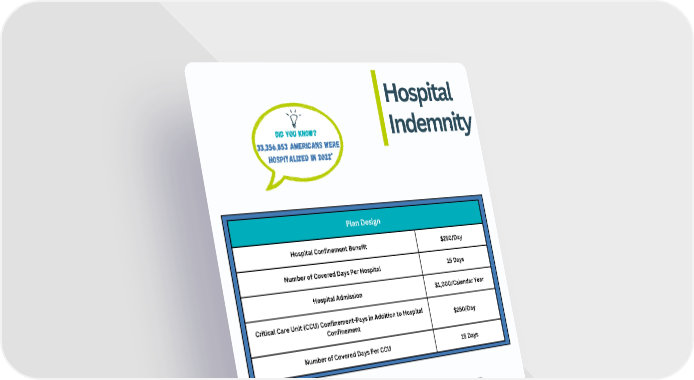 Hospital DID YOU KNOW? Indemnity 33,356,853 AMERICANS WERE HOSPITALIZED IN 2022* Plan Design Hospital Confinement Benefit $250/Day Number of Covered Days Per Hospital 15 Days Hospital Admission $1,000/Calendar Year Critical Care Unit (CCU) Confinement-Pays in Addition to Hospital $250/Day Confinement Number of Covered Days Per CCU 15 Days For pricing & more information, please refer to benefit packet *Source: AHA Hospital Statistics 2022