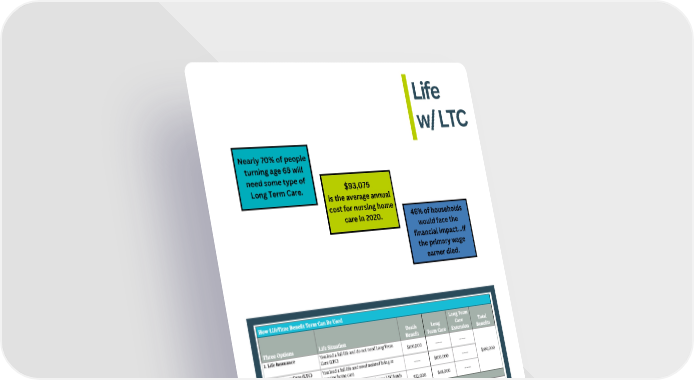 Life w/ LTC Nearly 70% of people turning age 65 will need some type of $93,075 Long Term Care. is the average annual cost for nursing home 46% of households care in 2020. would face the financial impact...if the primary wage earner died. For pricing & more information, please refer to benefit packet