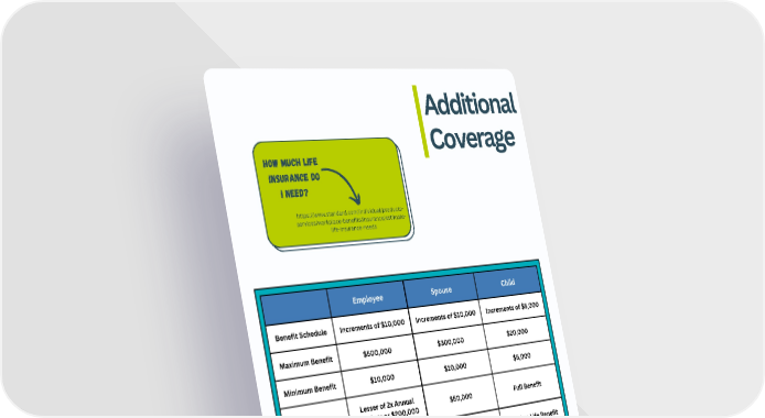 Additional Coverage How much Life Insurance do I need? https://www.standard.com/individual/products- services/workplace-benefits/insurance/estimate- life-insurance-needs Employee Spouse Child Benefit Schedule Increments of $10,000 Increments of $10,000 Increments of $5,000 Maximum Benefit $500,000 $300,000 $20,000 Minimum Benefit $10,000 $10,000 $5,000 Lesser of 2x Annual Guarantee Issue $50,000 Full Benefit Earnings or $200,000 AD&D Benefit Matches Life Benefit Matches Life Benefit Matches Life Benefit For pricing & more information, please refer to benefit packet