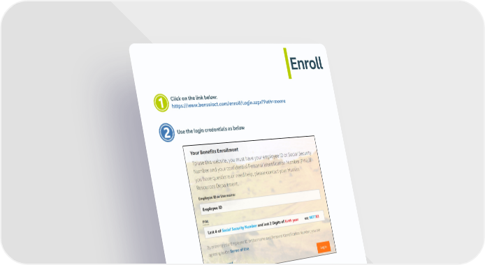 Enroll Click on the link below: https://www.benselect.com/enroll/Login.aspx?Path=moore Use the login credentials as below For technical assistance you may call Total Benefit Solutions at 888-783- 9653. (Hours M-TH 8:30 AM to 5:00 PM and Fridays until 4:00 PM CST) This guide can be found in the Library in the upper right hand corner of the Benefit Portal once you have logged in Please contact HR with any additional questions or concerns