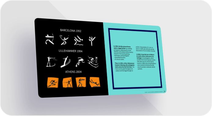 BARCELONA 1992 In 1992, the Barcelona Games artistic interpretation of a man on went a stage further by creating skis in a 4,000-year-old rock carving pictograms re昀氀ecting the visual discovered in Tro in northern Norway. LILLEHAMMER 1994 identity and emblem of the Games: based on the brush painting In 2004, it was the turn of Athens technique, each pictogram to make a direct reference to its resembled the lines heritage in its pictograms, which of a brush stroke. recalled the Ancient Olympic Games. The same was true of the Sydney Then, in 1994, at the Lillehammer Games in 2000, when the pictograms Games in Norway, the pictograms were centred on the boomerang, told a story for the 昀椀rst time. The one of Australia’s national cultural host country paid homage to its symbols. ATHENS 2004 culture and heritage through an 66 CHAP. 3 – 62 PICTOGRAMS, 62 BADGES OF HONOUR 32