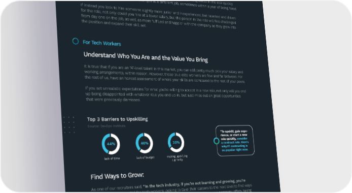ADVICE FROM THE EXPERTS FOR 2024 Learn the Value of Inexperience: Relatedly, even a perfect candidate that checks all the boxes of what you’re looking for and has all the skills you need for a role might not be all it cracks up to be. Our experts said that candidates who already have the skills needed to do their job well can end up being bored in the role quickly and might start looking for new challenges at a different job, sometimes within a year of being hired. If instead you look to hire someone slightly more junior and inexperienced, but talented and driven for the role, not only could you hire at a lower salary, but the person in the role will feel challenged from day one on the job, as well as more ful昀椀lled and happier with the company as they grow into the position and expand their skill set. For Tech Workers Understand Who You Are and the Value You Bring It is true that if you are an “A”-level talent in this market, you can still pretty much pick your salary and working arrangements, within reason. However, those true elite workers are few and far between. For the rest of us, have an honest assessment of where your skills are compared to the rest of your peers. If you set unrealistic expectations for what you’re willing to accept in a new role, not only will you end up being disappointed with whatever role you end up in, but also miss out on great opportunities that were previously dismissed. Top 3 Barriers to Upskilling Source: DevOps Institute "To upskill, gain expe- rience, or start a new 44% 40% 30% role quickly, consider a contract role. Here's why IT contracting is so popular right now. lack of time lack of budget making upskilling a priority Find Ways to Grow: As one of our recruiters said, “In the tech industry, if you’re not learning and growing, you’re falling behind.” It is vital for tech workers looking to take their careers to the next level to 昀椀nd ways to upskill and increase their value. That could be through opportunities your company offers, taking leadership courses or advanced degree classes part-time or taking advantage of all the numerous freely available trainings online. Have a conversation with your manager to see what skills the company is looking for, both in and out of your current role, and try and work towards 昀椀lling that gap. MOTIONRECRUITMENT.COM 20