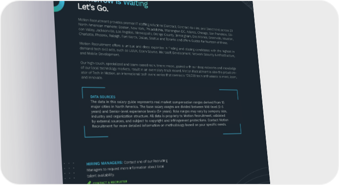 ABOUT US Tomorrow is Waiting Let's Go. Motion Recruitment provides premier IT staf昀椀ng solutions (Contract, Contract-to-Hire, and Direct Hire) across 23 North American markets: Boston, New York, Philadelphia, Washington DC, Atlanta, Chicago, San Francisco, Sili- con Valley, Jacksonville, Los Angeles, Minneapolis, Orange County, Birmingham, Des Moines, Greenville, Houston, Charlotte, Phoenix, Raleigh, Fort Worth, Dallas, Seattle and Toronto and offers Guides for fourteen of these. Motion Recruitment offers a unique and deep expertise in 昀椀nding and placing candidates with the highest in demand tech skill sets, such as UI/UX, Open Source, Microsoft Development, Network Security & Infrastructure, and Mobile Development. Our high-touch, specialized and team-based recruitment model, paired with our deep networks and knowledge of our local technology markets, result in an exemplary track record. Motion Recruitment is also the proud cre- ator of Tech in Motion, an international tech event series that connects 100,000 tech enthusiasts to meet, learn, and innovate. DATA SOURCES The data in this salary guide represents real market compensation ranges derived from 15 major cities in North America. The base salary ranges are divided between Mid-level (2-5 years) and Senior-level experience levels (5+ years). Role ranges may vary by company size, industry and organization structure. All data is propriety to Motion Recruitment, validated by external sources, and subject to copyright and infringement protections. Contact Motion Recruitment for more detailed information on methodology based on your speci昀椀c needs. HIRING MANAGERS: Contact one of our Recruiting Managers to request more information about local talent availability. CONTACT A RECRUITER JOB SEEKERS: Visit our website to 昀椀nd information about open roles in your local market. APPLY TO A JOB 3131