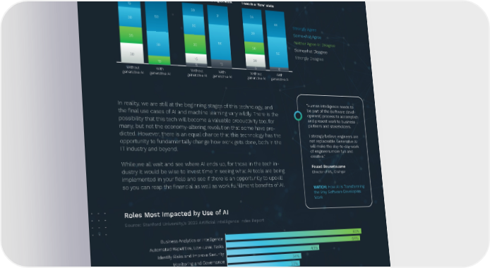 EMERGING TECHNOLOGY: ARTIFICIAL INTELLIGENCE Generative AI Tools for Developer Experience Source: McKinsey & Company I was able to focus on I felt happy satisfying and meaningful work I was in a ‘flow’ state 15 20 25 31 50 44 Strongly Agree 30 30 30 Somewhat Agree Neither Agree or Disagree 25 56 Somewhat Disagree 38 30 20 50 Strongly Disagree 30 15 20 13 5 13 5 6 Without With Without With Without With generative AI generative AI generative AI generative AI generative AI generative AI In reality, we are still at the beginning stages of this technology, and "Human intelligence needs to the 昀椀nal use cases of AI and machine learning vary wildly. There is the be part of the (software devel- opment) process to accomplish possibility that this tech will become a valuable productivity tool for and present work to business many, but not the economy-altering revolution that some have pre- partners and stakeholders. dicted. However, there is an equal chance that this technology has the I strongly believe engineers are opportunity to fundamentally change how work gets done, both in the not replaceable. Generative AI IT industry and beyond. will make the day-to-day work of engineers more fun and creative." While we all wait and see where AI ends up, for those in the tech in- Fouad Bousetouane dustry it would be wise to invest time in seeing what AI tools are being Director of ML, Grainger implemented in your 昀椀eld and see if there is an opportunity to upskill so you can reap the 昀椀nancial as well as work ful昀椀llment bene昀椀ts of AI. WATCH: How AI is Transforming the Way Software Developers Work Roles Most Impacted by Use of AI Source: Stanford University,'s 2023 Arti昀椀cial Intelligence Index Report Business Analytics or Intelligence 65% Automated Repetitive, Low-Level Tasks 64% Identify Risks and Improve Security 43% Monitoring and Governance 34% Conversational AI or Virtual Assistants 33% Augment Operational Staff in their Decision Making 28% Sensor Data Analysis 27% Financial Planning and Analysis 20% Content Creation 16% Define Business Strategy 12% HOW WILL AI CHANGE THE WAY SOFTWARE DEVELOPERS WORK? ION? Click to read 8 ways you can expect things to change. 17