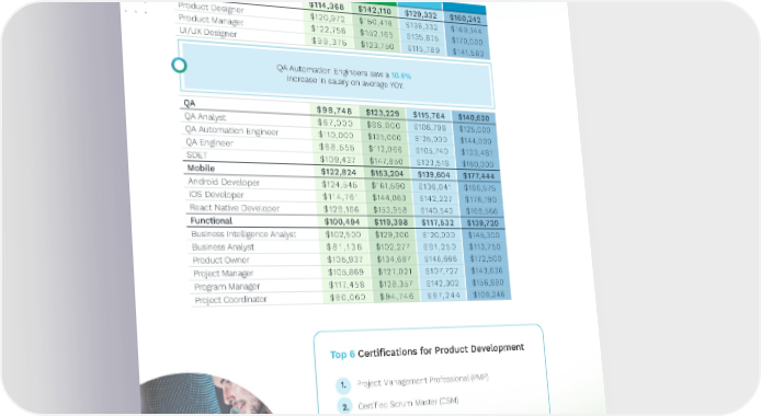 TECH SALARY RANGES Product + UX, QA, Mobile MID LEVEL SENIOR LEVEL LOW HIGH LOW HIGH Product & UX $114,368 $142,110 $129,332 $160,242 Product Designer $120,972 $150,416 $136,332 $169,144 Product Manager $122,758 $152,165 $135,875 $170,000 UI/UX Designer $99,375 $123,750 $115,789 $141,583 QA Automation Engineers saw a 10.6% increase in salary on average YOY. QA $98,748 $123,229 $115,764 $140,620 QA Analyst $87,000 $98,000 $108,798 $125,000 QA Automation Engineer $110,000 $135,000 $125,000 $144,000 QA Engineer $88,555 $112,066 $105,740 $133,481 SDET $109,437 $147,850 $123,518 $160,000 Mobile $122,824 $153,204 $139,604 $177,444 Android Developer $124,545 $161,590 $136,041 $186,575 iOS Developer $114,761 $144,063 $142,227 $176,190 React Native Developer $129,166 $153,958 $140,543 $169,566 Functional $100,494 $119,398 $117,532 $139,720 Business Intelligence Analyst $102,500 $129,300 $120,000 $145,300 Business Analyst $81,138 $102,277 $91,250 $113,750 Product Owner $105,937 $134,687 $146,666 $172,500 Project Manager $105,869 $127,021 $107,727 $143,636 Program Manager $117,458 $128,357 $142,302 $156,890 Project Coordinator $90,060 $94,746 $97,244 $106,246 Top 6 Certi昀椀cations for Product Development 1. Project Management Professional (PMP) 2. Certi昀椀ed Scrum Master (CSM) 3. Certi昀椀ed Manager Certi昀椀cation (CM) 4. Certi昀椀ed Scrum Product Owner (CSPO) 5. Certi昀椀ed Product Manager (CPM) 6. Master Project Manager (MPM) 2727