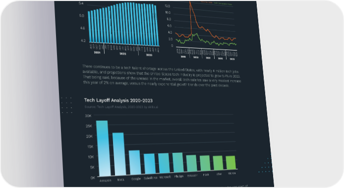 STATE OF TECH EMPLOYMENT Tech Industry Employment Unemployment Rate Trending Source: U.S. Bureau of Labor Statistics Source: U.S. Bureau of Labor Statistics 5.8 14.0 National Rate Tech Occupation Rate 12.0 5.4 10.0 ojectedojected8.0 5.0 prpr 6.0 4.6 4.0 2.0 4.2 0 G T V C N Y G T V C N Y G N Y V N Y V N Y V N Y V N Y V AUSEPOCNODE JAFEBMARAPRMAJUNJULAUSEPOCNODEJAFEBMARAPRMAJUNJULAU JAMARMAJULSEPNOJAMARMAJULSEPNOJAMARMAJULSEPNOJAMARMAJULSEPNOJAMARMAJULSEPNO 2021 2022 2023 2019 2020 2021 2022 2023 There continues to be a tech talent shortage across the United States, with nearly 4 million tech jobs available, and projections show that the United States tech industry is projected to grow 5.4% in 2023. That being said, because of the unease in the market, overall tech salaries saw a very modest increase this year of 2% on average, versus the nearly exponential growth trends over the past decade. Tech Layoff Analysis 2020-2023 Source: Tech Layoff Analysis, 2020-2023 by skills.ai 30K 25K 20K 15K 10K 5K 0K Amazon Meta Google Salesforce Microsoft Phillips Ericsson Flink Uber Micron An important part of the story of 2023 – and what we can learn from it in 2024 – is who was part of the tech layoffs, both company and personnel-wise. Accounting for 42% of all tech layoffs this year, FAANG companies (Meta, Apple, Amazon, Net昀氀ix, Alphabet) were the biggest sources of job loss. This must be put into context, as these companies, along with Microsoft, have been on a steady hiring spree since 2019. Compared to the number of people hired by these companies since 2019, the lay- offs of 2023 only account for 8% of that workforce. MOTIONRECRUITMENT.COM 04