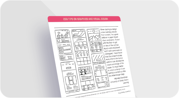233 TIPS ON GRAPHICS AND VISUAL DESIGN When starting to design a new learning website from scratch, I’m a great believer in paper-based clean wireframes. I’ll start with this first—to get an idea of the optimal layout—and storyboard test it with some users (or colleagues). I have found that this simple first step really informs the layout, which in turn dictates the visuals and design of the pages. It’s much harder to unpick a design if user testing is carried out after the initial design stage. Michelle Boardman, University of Derby Online Learning Review your work from the point of view of the end user, and ask yourself if this would be satisfactory to you. Doug Belding, SweetRush 56 www.eLearningGuild.com