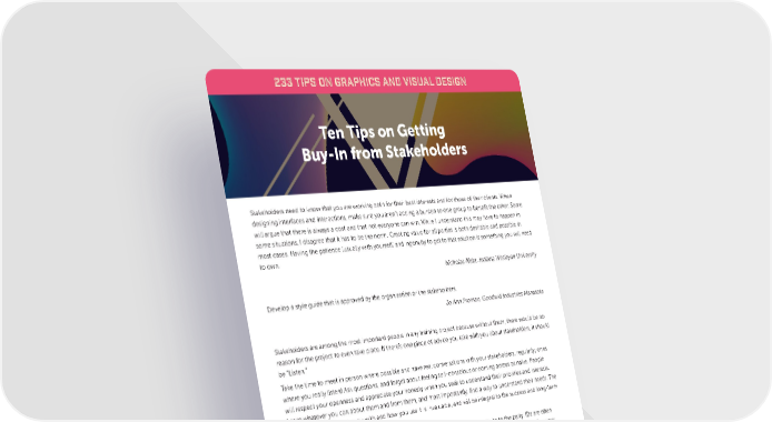233 TIPS Graphics and Visu De al sign 233 TIPS ON GRAPHICS AND VISUAL DESIGN Ten Tips on Getting Buy-In from Stakeholders Stakeholders need to know that you are working both for their best interests and for those of their clients. When designing interfaces and interactions, make sure you aren’t adding a burden to one group to benefit the other. Some will argue that there is always a cost and that not everyone can win. While I understand this may have to happen in some situations, I disagree that it has to be the norm. Creating value for all parties is both desirable and possible in most cases. Having the patience (usually with yourself) and ingenuity to get to that solution is something you will need to own. Nicholas Rider, Indiana Wesleyan University Develop a style guide that is approved by the organization or the stakeholders. Jo Ann Froman, Goodwill Industries Manasota Stakeholders are among the most important people in any training project because without them, there would be no reason for the project to even take place. If there’s one piece of advice you take with you about stakeholders, it should be “Listen.” Take the time to meet in person where possible and have real conversations with your stakeholders, regularly; ones where you really listen! Ask questions, and forget about feeling self-conscious or coming across as naïve. People will respect your openness and appreciate your honesty when you seek to understand their priorities and interests. Learn whatever you can about them and from them, and most importantly, find a way to understand their needs. The information they provide you with and how you use it is invaluable, and will be integral to the success and long-term benefits of your work. Sadly, in many projects, training is treated like an add-on that gets a last-minute invite to the party. IDs are often discouraged to take the time to meet with stakeholders but told instead to just “get on with” designing. On every project I’ve ever worked on where the stakeholders were fully engaged, the results of the training were outstanding and genuinely made a difference to the participants and to the organization as a whole. Not only that, but the training delivery continued beyond the bounds of the project and often led to further training projects as a result. Be courageous, build relationships with your stakeholders, and seek to understand their priorities. Their commitment and contribution will be one of the most valuable assets you have in your design tool kit. After all, even with all the models, systems, and structure in the world, training is really about the people. Laura Hesketh, Tree Frog Training 52 www.eLearningGuild.com