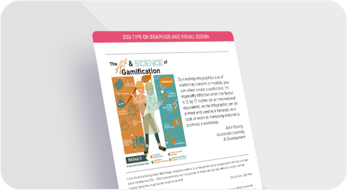 233 TIPS ON GRAPHICS AND VISUAL DESIGN By creating infographics out of workshop content or models, you can often create a useful tool. It’s especially effective when the layout is 11 by 17 inches (or an international equivalent), as the infographic can be printed and used as a handout, as a tool, or even as marketing material to promote a workshop. John Boring, Accelerate Learning & Development I love to pick a bold graphic that brings context to content. I use the graphic as my background on the slide and then place my text in a 13% – 15% transparent box over the graphic. It makes the slide pop with visual appeal, and the graphic helps the visual learner relate to content. Salicia Pultz, OpEx Now One of the best ways to make your design look professional is to consistently use a gridded layout. It harmonizes the elements on your page or screen and prevents the “jumping” effect when moving from one screen to the next. A good grid allows a lot of flexibility in where you can place your titles, text, and graphics while maintaining a consistent look and feel. If you are unsure of what a grid is or how it is used, simply do a web search for “layout grid” to find examples and inspiration. Bob Joyce, University of Texas MD Anderson Cancer Center 23 www.eLearningGuild.com