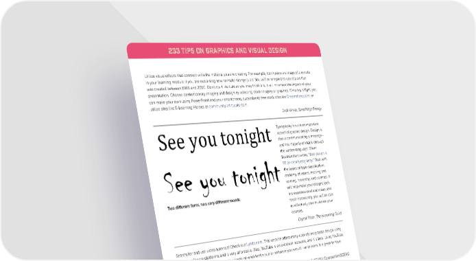 233 TIPS ON GRAPHICS AND VISUAL DESIGN Utilize visual effects that connect with the material you are creating. For example, don’t place an image of a tomato in your learning module if you are explaining how to make orange juice. You will be tempted to use clip art that was created between 1980 and 2000. Don’t do it. As cute as you may think it is, it will minimize the impact of your presentation. Choose contemporary imagery and design by selecting stock imagery or graphics. If money is tight, you can make your own using PowerPoint and your smartphone; subscribe to free stock sites like Dreamstime.com; or utilize sites like E-Learning Heroes at community.articulate.com. Jodi Hinkle, SandRidge Energy Typography is such an important aspect of graphic design. Design is about communicating a message— and the majority of that is through the written language. Oliver Reichenstein wrote, "Web design is 95 percent typography." Start with the basics of type classification, anatomy of letters, tracking and kerning, hierarchy, and contrast. It will help make your designs look Two different fonts, two very different moods. more professional and clean, and most importantly, you will be able to effectively communicate your content. Crystal Rose, The eLearning Guild Search for and use video tutorials! Check out Lynda.com. This website offers many tutorials on graphic design using various software platforms and is very affordable. Also, YouTube is an excellent resource, and it is free. Using YouTube, specify a search based on specific criteria of what technique or software you would like to learn. It is great to have these on-demand resources at your fingertips. Linda Caldwell, SCANA Corporation/SCE&G Listen to everyone’s ideas and feedback. Ideas can surprise you, and the seed of the next great idea may come from an unlikely source. Shane Donahue, SweetRush 8 www.eLearningGuild.com
