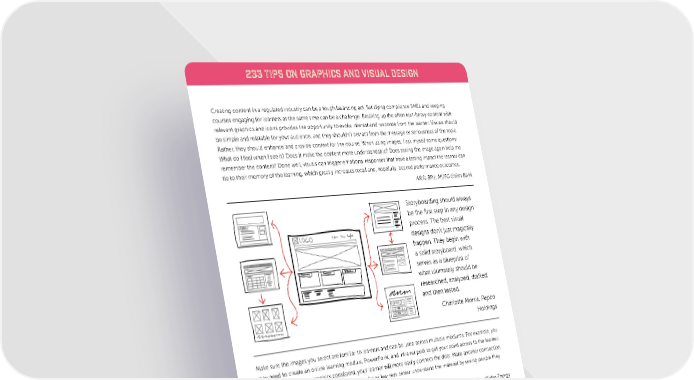 233 TIPS ON GRAPHICS AND VISUAL DESIGN Creating content in a regulated industry can be a tough balancing act. Satisfying compliance SMEs and keeping courses engaging for learners at the same time can be a challenge. Breaking up the often text-heavy content with relevant graphics and icons provides the opportunity to evoke interest and response from the learner. Visuals should be simple and relatable for your audience, and they shouldn’t detract from the message or seriousness of the topic. Rather, they should enhance and provide context for the course. When using images, I ask myself some questions: What do I feel when I see it? Does it make the content more understandable? Does seeing the image again help me remember the content? Done well, visuals can trigger emotional responses that have a lasting impact the learner can tie to their memory of the learning, which greatly increases recall and, hopefully, desired performance outcomes. Alicia Blitz, MUFG Union Bank Storyboarding should always be the first step in any design process. The best visual designs don’t just magically happen. They begin with a solid storyboard, which serves as a blueprint of what ultimately should be researched, analyzed, drafted, and then tested. Charlotte Morris, Pepco Holdings Make sure the images you select are familiar to learners and can be used across multiple mediums. For example, you may need to create an online learning module, PowerPoint, and intranet post to get your point across to the learner. When you make these graphics consistent, your learner will more easily connect the dots. Make another connection by using internal talent whenever possible. This helps learners better understand the material by seeing people they recognize and can relate to. Jodi Hinkle, SandRidge Energy Gather all content and information that might be used in a project. Identify the most difficult content, and use that in your initial designs to ensure consistency in your design. Look at how information can be simplified. Utilize feedback loops with your audience members to gather input on what works and what doesn’t at an early stage to assure stakeholders that your vision is the best fit for your audience’s needs. Nick Floro, Sealworks Interactive Studios 22 www.eLearningGuild.com