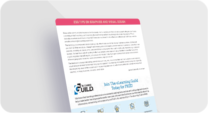 233 TIPS ON GRAPHICS AND VISUAL DESIGN Know what communicates to your audience visually. I am a learning architect and not a graphic designer, but I apply a technique that I routinely use in learning development to validate visual design choices for my projects. This is basically an extension of the all-important “know your audience” dictum that is so critical to get right if you want to provide a meaningful learning experience. The technique is simple and can be done quickly. After I share an item for review, I ask two questions: (1) What did you like? (2) What would you change? I ask these questions to target audience members in person or, when this is not possible, remotely via phone, email, and sometimes surveys (when the visual is particularly important, e.g., a program banner). So that this is not off-putting to the busy people whose opinion I value, I let them know that I would like a quick response that will require just a couple of minutes. I also try to get responses from people who represent different geographic locations, levels of experience, age groups, etc. The feedback is always interesting, sometimes surprising, and, more times than not, I will update or even replace a visual because of what I’ve learned. Applying this approach has certainly improved the overall quality and, especially, the storytelling value of the visuals I use in my learning solutions—all with minimal effort. It’s a simple technique but one that, in many situations, can add a lot of value. James Goldsmith, Accenture Join The eLearning Guild Today for FREE! We know that learning professionals are constantly seeking best practices and cutting-edge techniques to help create better learning experiences for everyone. We want the Guild to be your first stop for eLearning information, networking, and community, and that’s why membership in The eLearning Guild is FREE. DemoFest Archive Webinars Select eBooks and Conference handouts Learning Solutions white papers and session videos Magazine Supplier and product Newsletters TWIST Blog Search for jobs and And more... directories resumes on the Job Board www.eLearningGuild.com +1.707.566.8990 57 www.eLearningGuild.com