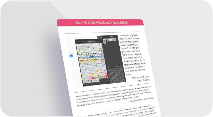 233 TIPS ON GRAPHICS AND VISUAL DESIGN Use the built-in Symbols library in Adobe Illustrator to create simple graphics. Add the symbol to your image. Then, right-click on it and choose “break link to symbol,” ungroup the elements, and edit as needed. The symbol graphic itself may not fit your needs, but one or more elements from it may work for your design. Tama Minter, St. Cloud State University Starting out in a technical communications career can be daunting. I have been working with graphics and web design for several years. My tip is to encourage technical designers, writers, and communicators to expand your skills into video. Although your designs may work in the print and online worlds, the fast-growing future is video. Knowing how to incorporate your work into video will be priceless and highly sought-after in the near future. Ken Weatherford, Technical Writer Training Try not to get “freshman artist syndrome.” There are many effects and filters you can use in photo manipulation products these days. When first starting out, you will feel the need to use many of them in most of your projects, but don’t do it. Often the message can be conveyed using a simple technique. If you have found your career calling, you will be working on many projects in the years ahead. That means the right projects will come along when it does make sense for you to use those filters. Jill Mohler, Moffitt Cancer Center 7 www.eLearningGuild.com