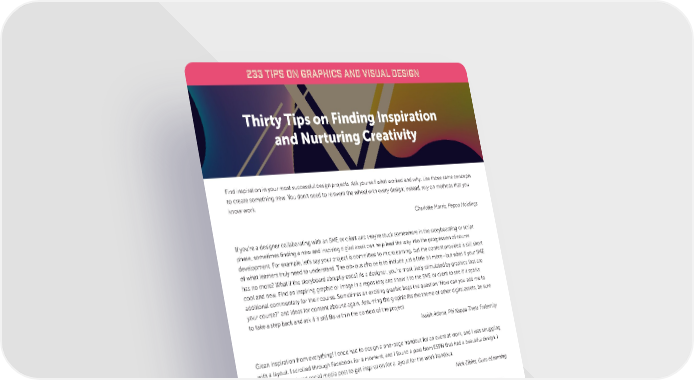 233 TIPS Graphics and Visu De al sign 233 TIPS ON GRAPHICS AND VISUAL DESIGN Thirty Tips on Finding Inspiration and Nurturing Creativity Find inspiration in your most successful design projects. Ask yourself what worked and why. Use those same concepts to create something new. You don’t need to reinvent the wheel with every design; instead, rely on methods that you know work. Charlotte Morris, Pepco Holdings If you’re a designer collaborating with an SME or client and they’re stuck somewhere in the storyboarding or script phase, sometimes finding a new and inspiring digital asset can help lead the way into the progression of course development. For example, let’s say your project is committed to microlearning, but the content provided is still short of what learners truly need to understand. The obvious choice is to include just a little bit more—but what if your SME has no more? What if the storyboard abruptly ends? As a designer, you’re most likely stimulated by graphics that are cool and new. Find an inspiring graphic or image in a repository and show it to the SME or client to see if it sparks additional commentary for their course. Sometimes an exciting graphic begs the question “How can you add me to your course?” and ideas for content abound again. Assuming the graphic fits the theme of other digital assets, be sure to take a step back and ask if it still fits within the context of the project. Isaiah Adona, Phi Kappa Theta Fraternity Glean inspiration from everything! I once had to design a one-page handout for an event at work, and I was struggling with a layout. I scrolled through Facebook for a moment, and I found a post from ESPN that had a beautiful design. I used the NFL-related social media post to get inspiration for a layout for the work handout. Nick Elkins, Guru eLearning Immerse yourself in the principles of design by: reading books; looking at design magazines like HOW and Creative Arts; viewing documentaries like Helvetica (available through Netflix); looking at websites not for content, but for design; and talking to graphic designers about how they work. Look for good and bad design everywhere, including billboards, magazines, TV, and movies. Looking at other people’s work is also motivating and can be a starting point for your project. Sometimes I look at over 100 designs before settling on one that works for me and my client. Jodi Hinkle, SandRidge Energy 10 www.eLearningGuild.com