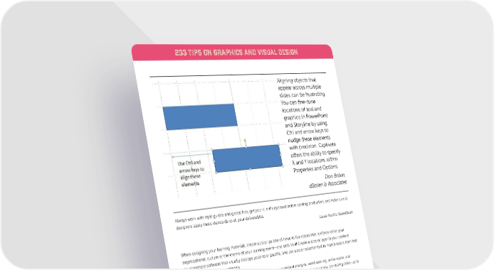 233 TIPS ON GRAPHICS AND VISUAL DESIGN Aligning objects that appear across multiple slides can be frustrating. You can fine-tune locations of text and graphics in PowerPoint and Storyline by using Ctrl and arrow keys to nudge these elements with precision. Captivate offers the ability to specify X and Y locations within Properties and Options. Don Bolen, dBolen & Associates Always work with style guides and global files, get your client’s approval before starting production, and make sure all designers apply these standards to all your deliverables. Laura Murillo, SweetRush When designing your learning materials, create a color palette of three to five colors that reinforce either your organizational culture or the theme of your learning event—and stick to it! Create a slide or layer in your content development software that visually displays your color palette, and use a color selector tool to match colors from that layer as you design your materials. Also, use guides for everything you create! This will ensure consistent margins, word spacing, white space, and graphics placement. Trying to “eyeball it” will always result in missing something because you are staring close-up at your screen throughout the process. Theresa Decker, Samaritan’s Purse Make a custom palette using your brand colors, and compliance is at hand. If your logo is required to be in a specific space, combine the palette and master slide. Crisa McCarty, Aflac Keep the same design (stick to a specific color palette and style) throughout the eLearning project to keep it consistent and streamlined. Chantal Rioux, Manulife 48 www.eLearningGuild.com