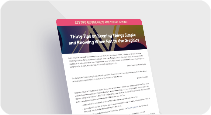 233 TIPS Graphics and Visu De al sign 233 TIPS ON GRAPHICS AND VISUAL DESIGN Thirty Tips on Keeping Things Simple and Knowing When Not to Use Graphics Avoid cognitive overload. It’s tempting to put everything on the screen all at once, but a learner can only focus on one thing at a time. So, be judicious on what you show and when you show it. Also, don’t repeat the exact text that is read aloud via voice over narration in the same text on screen. It can actually diminish the efficacy of the point you are trying to make. In short, keep it simple in bite-sized knowledge chunks. Kevin Darbro, Dell Technologies Simplicity rules. Speakers may find a compelling photo sufficient to remind them of key training points. In eLearning, a series of simple layers and slides will out-communicate a complicated one. Crisa McCarty, Aflac Graphics should be included for a reason. When I was starting out as a second-year college student, I had Elmo on my website. I wasn’t brought up on Sesame Street (I’m from a different culture), but I really liked that creature (along with the one sitting in the trash can). Well, Elmo was jumping up and down on the page. Although the site itself was helpful to my users, Elmo shouldn’t have been in the middle of the page dancing. • Use graphics for a reason (they should fit with the theme, your topic, and the humor). • Be careful with any kind of moving objects on your sites and in your eLearning. Ask yourself three times if they help. Ask yourself three times if they are distracting. • Maintain a library and a link of sites with good free graphics. The E-Learning Heroes site has a ton of suggestions. • Show empathy to the user. A clear, simple, elegant page may be your answer. Keep it simple! Irene Knokh, University of Michigan Hospital Ask yourself: “What action should the learner take after viewing the design?” Do you want them to remember something specific? If so, how can you make it memorable enough? Humor or emotion? A strong visual image? Very large or bold text? Color? White space (not necessarily white in color)? Interaction? Then, ask yourself how that balances with the rest of the content and design. Establish visual hierarchy, maintain consistency, and remember that less is more. Jennifer Jesse, D10 Interactive 42 www.eLearningGuild.com