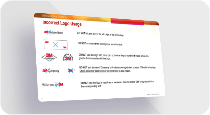 3M Brand Identity Guidelines Incorrect Logo Usage DO NOT link any text to the left, right or top of the logo. DO NOT use more than one logo per visual surface. DO NOT use the logo with, or as part of, another logo or symbol or create a logo-like graphic that competes with the logo. DO NOT add the word “Company” or trademark or registration symbols (TM or ®) to the logo. Check with your legal counsel for exceptions in your region. DO NOT use the logo in headlines or sentences. Use the letters “3M” in the same font as the corresponding text. 8 3M Confidential. 30 Oc©to be3Mr 2013. All Rights Reserved.