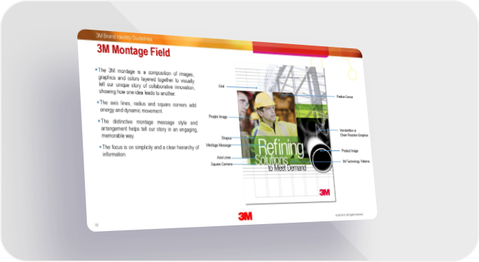 3M Brand Identity Guidelines 3M Montage Field The 3M montage is a composition of images, graphics and colors layered together to visually Grid tell our unique story of collaborative innovation, Radius Corner showing how one idea leads to another. The axis lines, radius and square corners add energy and dynamic movement. People Image The distinctive montage message style and arrangement helps tell our story in an engaging, Handwritten or memorable way. Chain Reaction Graphics Shapes The focus is on simplicity and a clear hierarchy of Montage Message information. Product Image Axis Lines Square Corners 3M Technology Patterns 15 3M Confidential. 30 Oc©to be3Mr 2013. All Rights Reserved.