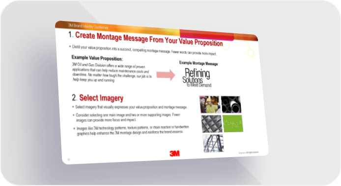 3M Brand Identity Guidelines 1. Create Montage Message From Your Value Proposition Distill your value proposition into a succinct, compelling montage message. Fewer words can provide more impact. Example Value Proposition: Example Montage Message: 3M Oil and Gas Division offers a wide range of proven applications that can help reduce maintenance costs and downtime. No matter how tough the challenge, our job is to help keep you up and running. 2. Select Imagery Select imagery that visually expresses your value proposition and montage message. Consider selecting one main image and two or more supporting images. Fewer images can provide more focus and impact. Images like 3M technology patterns, texture patterns, or chain reaction or handwritten graphics help enhance the 3M montage design and reinforce the brand essence. 17 3M Confidential. 30 Oc©to be3Mr 2013. All Rights Reserved.