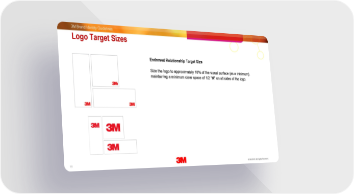 3M Brand Identity Guidelines Logo Target Sizes Endorsed Relationship Target Size Size the logo to approximately 10% of the visual surface (as a minimum). maintaining a minimum clear space of 1/2 "M" on all sides of the logo. 11 3M Confidential. 30 Oc©to be3Mr 2013. All Rights Reserved.