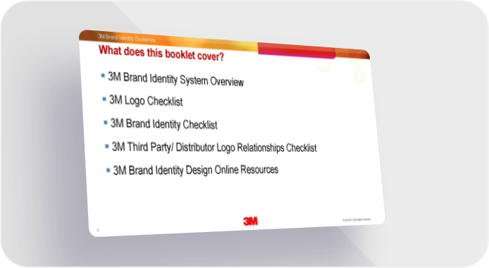 3M Brand Identity Guidelines What does this booklet cover? 3M Brand Identity System Overview 3M Logo Checklist 3M Brand Identity Checklist 3M Third Party/ Distributor Logo Relationships Checklist 3M Brand Identity Design Online Resources 3 3M Confidential. 30 Oc©to be3Mr 2013. All Rights Reserved.