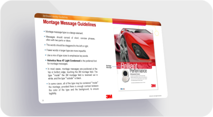 3M Brand Identity Guidelines Montage Message Guidelines Montage message type is a design element. Messages should consist of short, concise phrases, often with two parts or ideas. The words should be staggered to the left or right. Fewer words in larger type are more impactful. Use a mix of type sizes to emphasize key words. Helvetica Neue 47 Light Condensed is the preferred font for montage messages. Montage In most cases, montage messages are positioned at the Message top or bottom edge, touching the 3M montage field. The type “inside” the 3M montage field is reversed out in white, and the type “outside” is black. In some cases, all of the type may be contained “inside” the montage, provided there is enough contrast between the color of the type and the background, to ensure legibility. 25 3M Confidential. 30 Oc©to be3Mr 2013. All Rights Reserved.