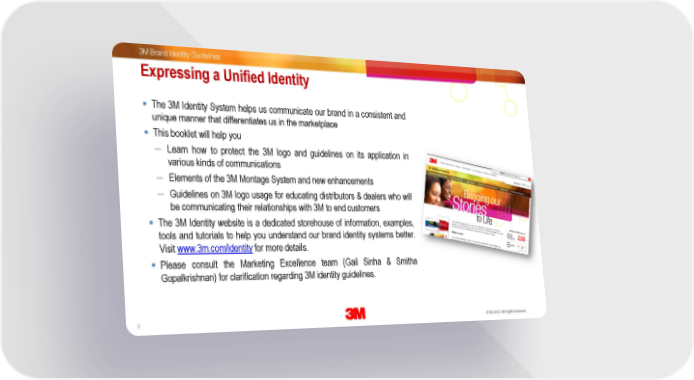 3M Brand Identity Guidelines Expressing a Unified Identity The 3M Identity System helps us communicate our brand in a consistent and unique manner that differentiates us in the marketplace This booklet will help you ― Learn how to protect the 3M logo and guidelines on its application in various kinds of communications ― Elements of the 3M Montage System and new enhancements ― Guidelines on 3M logo usage for educating distributors & dealers who will be communicating their relationships with 3M to end customers The 3M Identity website is a dedicated storehouse of information, examples, tools and tutorials to help you understand our brand identity systems better. Visit www.3m.com/identity for more details. Please consult the Marketing Excellence team (Gail Sinha & Smitha Gopalkrishnan) for clarification regarding 3M identity guidelines. 2 3M Confidential. 30 Oc©to be3Mr 2013. All Rights Reserved.