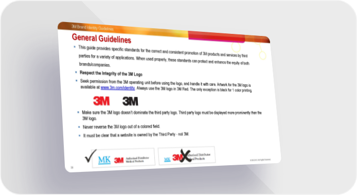 3M Brand Identity Guidelines General Guidelines This guide provides specific standards for the correct and consistent promotion of 3M products and services by third parties for a variety of applications. When used properly, these standards can protect and enhance the equity of both brands/companies. Respect the Integrity of the 3M Logo Seek permission from the 3M operating unit before using the logo, and handle it with care. Artwork for the 3M logo is available at www.3m.com/identity. Always use the 3M logo in 3M Red. The only exception is black for 1 color printing. Make sure the 3M logo doesn’t dominate the third party logo. Third party logo must be displayed more prominently than the 3M logo. Never reverse the 3M logo out of a colored field. It must be clear that a website is owned by the Third Party - not 3M. 36 3M Confidential. 30 Oc©to be3Mr 2013. All Rights Reserved.