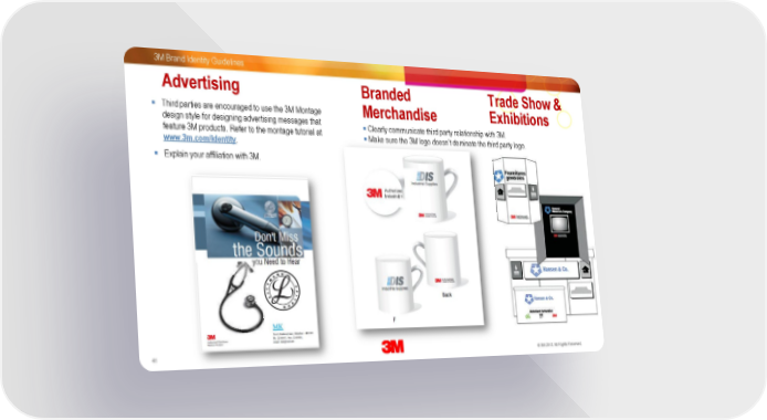 3M Brand Identity Guidelines Advertising Branded Trade Show & Third parties are encouraged to use the 3M Montage Merchandise Exhibitions design style for designing advertising messages that Clearly communicate third party relationship with 3M. feature 3M products. Refer to the montage tutorial at Make sure the 3M logo doesn’t dominate the third party logo. www.3m.com/identity. Explain your affiliation with 3M. 41 3M Confidential. 30 Oc©to be3Mr 2013. All Rights Reserved.