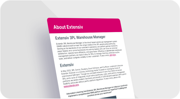 About Extensiv Extensiv 3PL Warehouse Manager Extensiv 3PL Warehouse Manager, is the cloud-based warehouse management system (WMS) solutions built to meet the unique needs of the 3PL warehousing community. Serving as the backbone of our customer’s operations, our platform quickly transforms paper-based, error-prone businesses into service leaders who can focus on customer satisfaction, operate more efficiently, and grow faster. Offering a comprehensive warehouse management platform, we make it easy for 3PLs to manage inventory, automate routine tasks, and deliver complete visibility to their customers. To learn more, click here. Extensiv In May 2022, 3PL Central, Skubana, Scout Software, and CartRover combined to become Extensiv. Extensiv is a visionary technology leader focused on creating the future of omnichannel fulfillment. Through our unrivaled network of more than 1,500 connected 3PLs and a suite of integrated, cloud-native warehouse, order, and inventory management platforms we enable modern merchants and brands to fulfill demand anywhere with superior flexibility and scale without painful platform migrations. To learn more, please visit www.extensiv.com. Interested in learning how Extensiv 3PL Warehouse Manager can help your warehouse implement a comprehensive WMS platform and share our expertise in building best practices across your warehouse? REQUEST A DEMO HERE For more information, please call us at 888.983.6748 or visit us online at www.extensiv.com. FOLLOW US © 2022 Extensiv I All rights reserved. extensiv.com | 833.983.6748 18