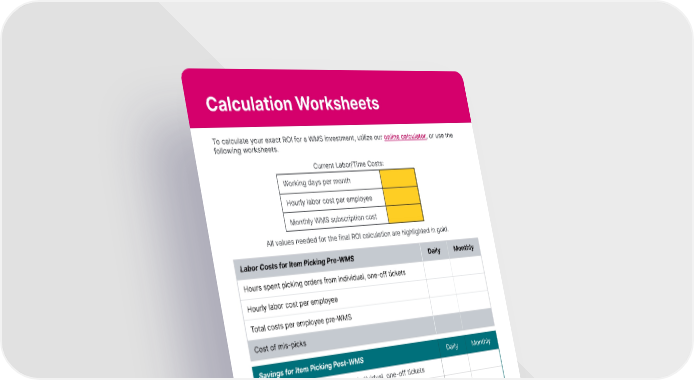 Calculation Worksheets To calculate your exact ROI for a WMS investment, utilize our online calculator, or use the following worksheets. Current Labor/Time Costs: All values needed for the final ROI calculation are highlighted in gold. extensiv.com | 833.983.6748 15